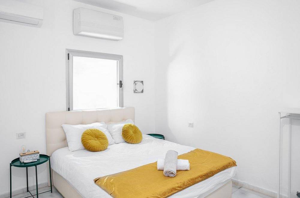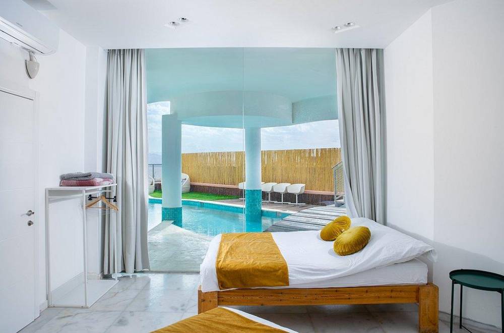 חדר שינה 1- 33 מ"ר- מיטה זוגית, טלוויזיה, מיזוג אוויר, חדר רחצה פרטי ונוף לבריכה
