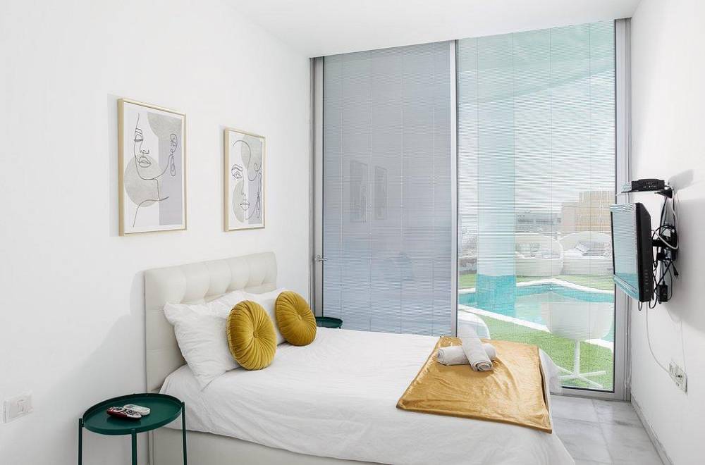 חדר שינה 3- 30 מ"ר- מיטה זוגית, טלוויזיה, מיזוג אוויר, חדר רחצה פרטי ונוף לבריכה