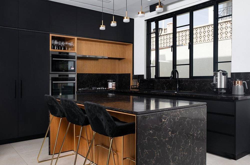 מטבח מאובזר קומפלט בעיצוב מודרני הכולל מקרר גדול, 2 תנורי אפייה, כיריים גז, קומקום חשמלי,