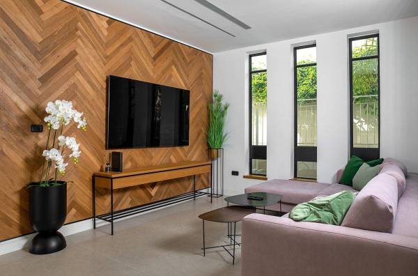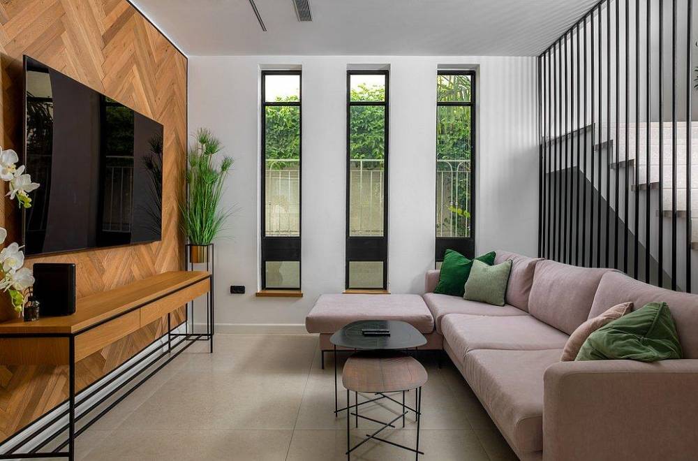 סלון מרווח ומעוצב עם ספה נוחה ומולה טלוויזיה.