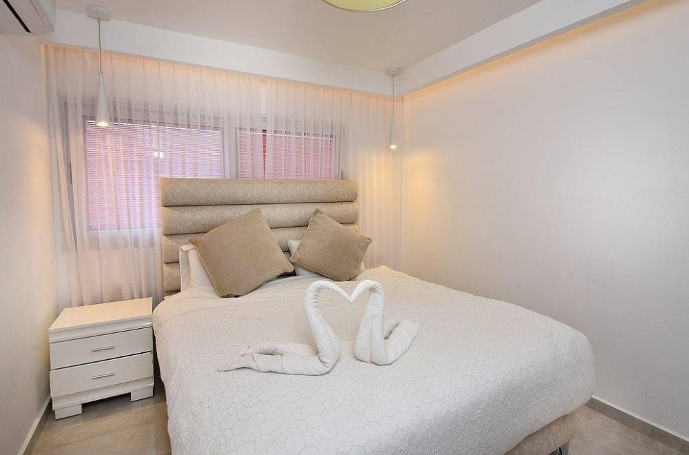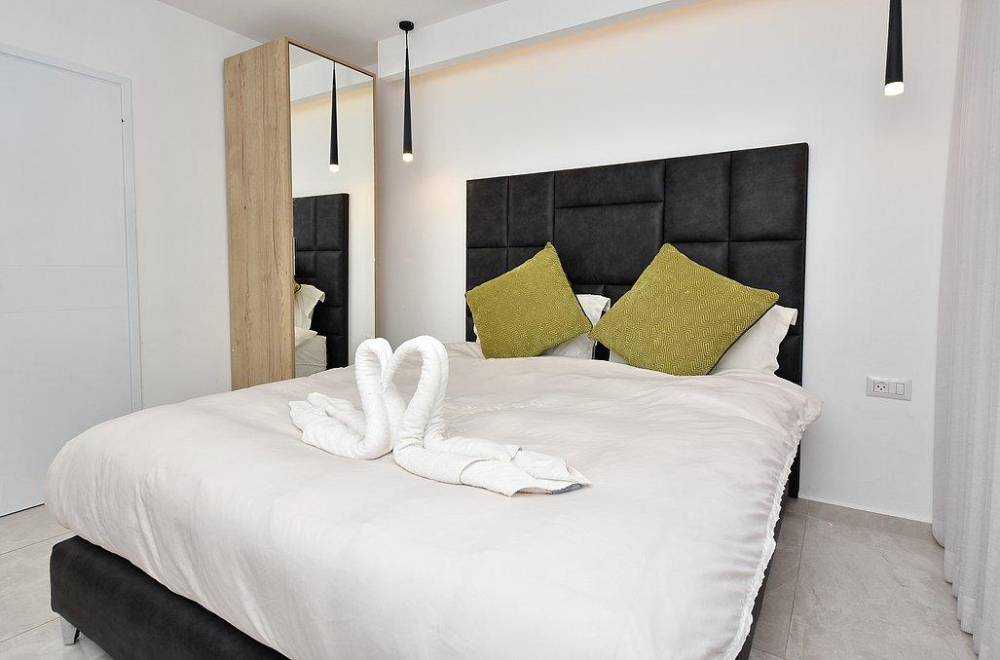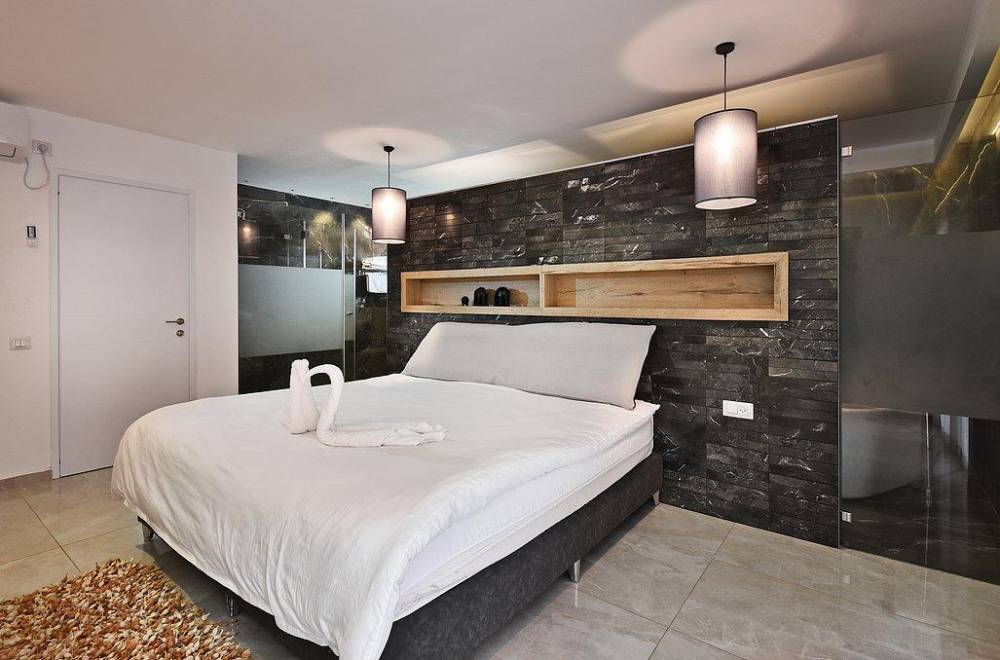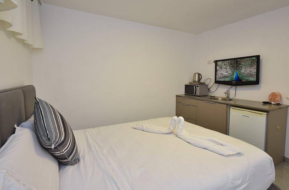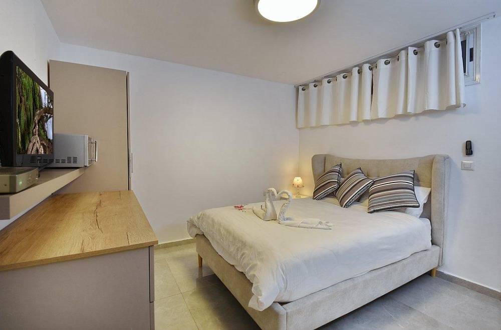 מיטה זוגית, שידות אחסון, ארון בגדים, מזגן וטלוויזיה.