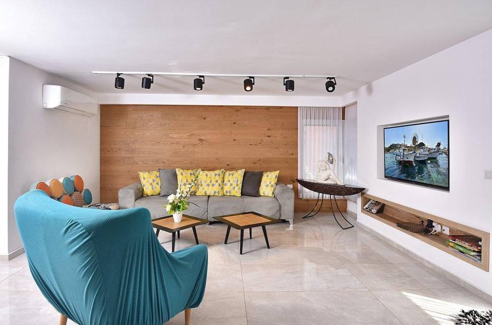 סלון עם מערכת ישיבה מרווחת וטלוויזיה עם חיבור לערוצים.