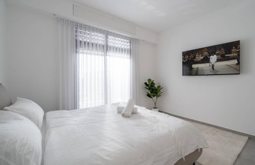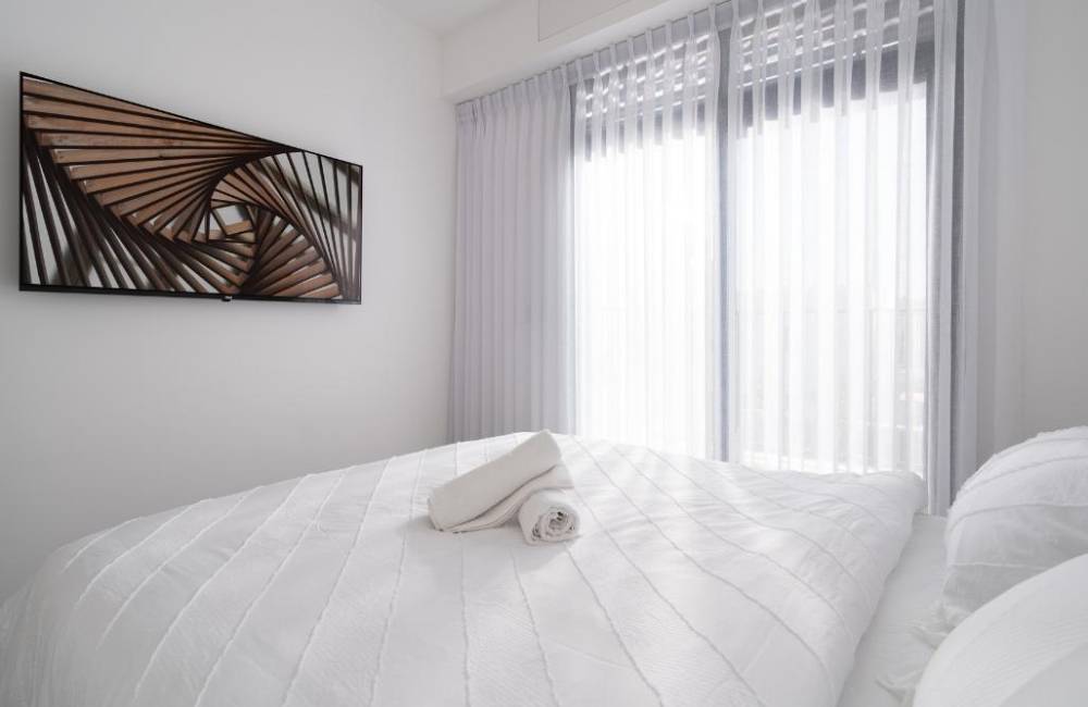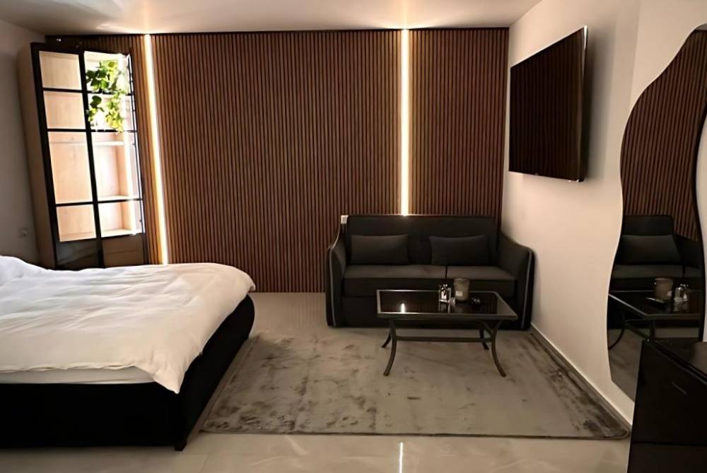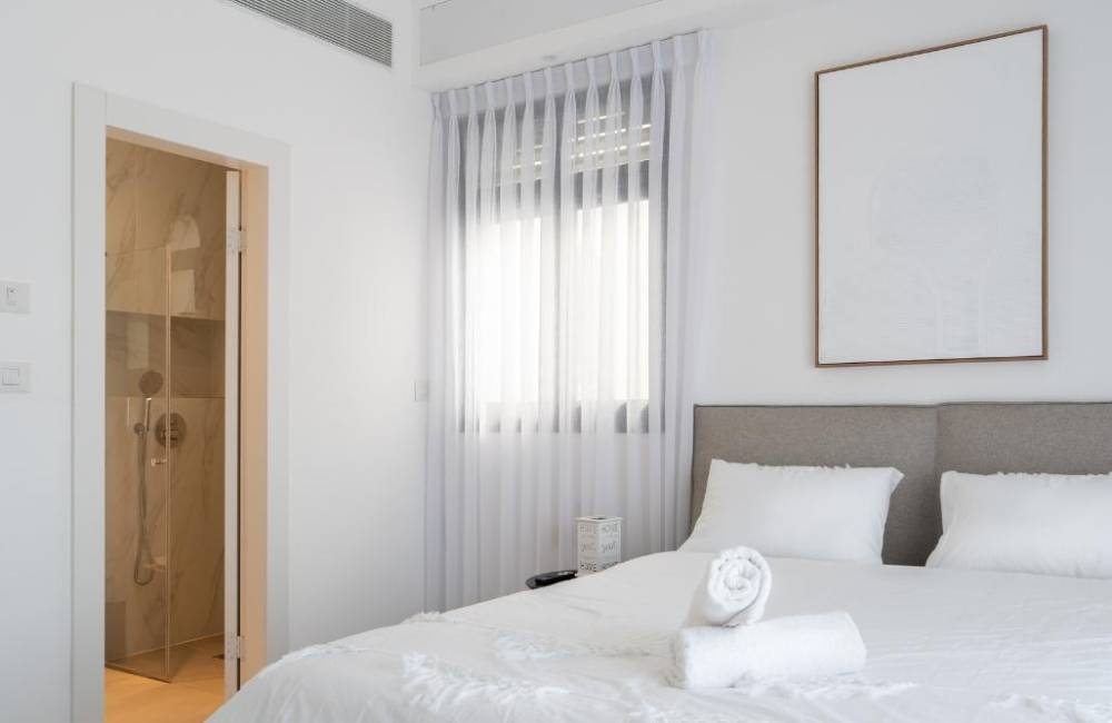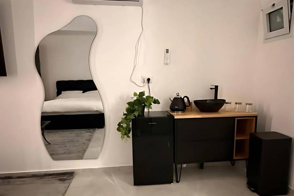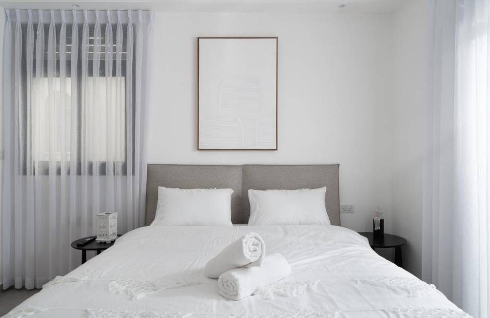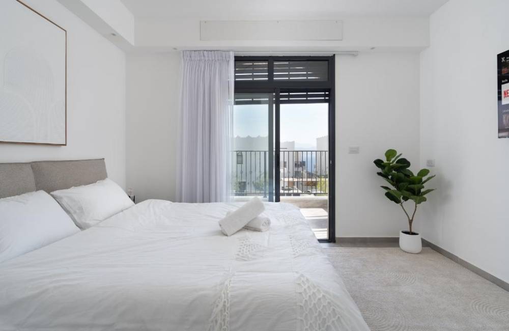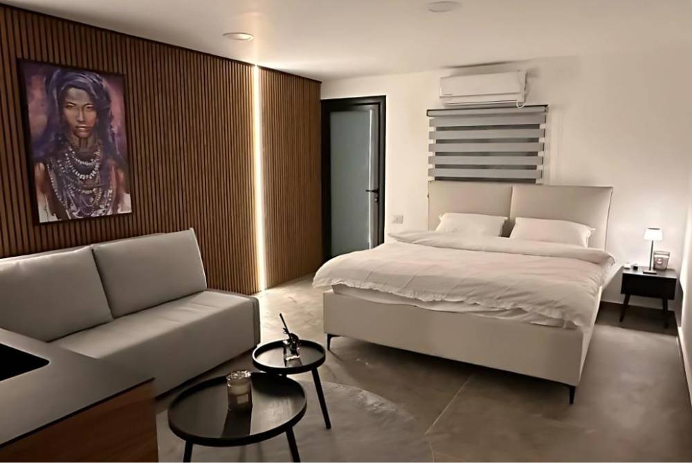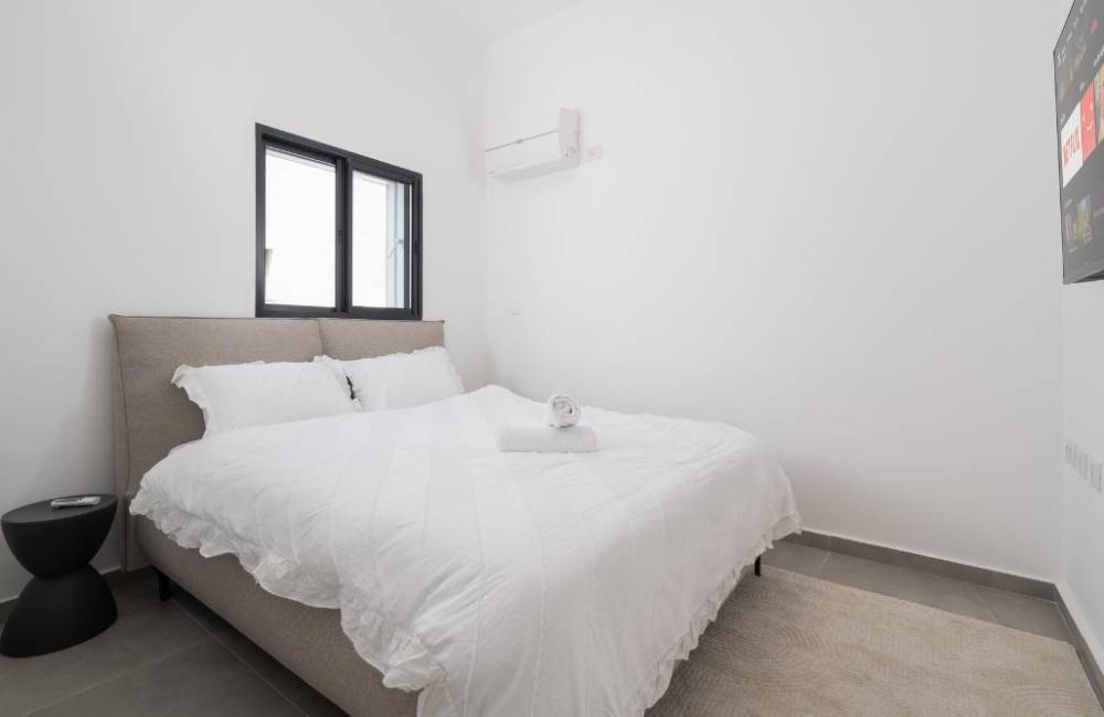 אבזור החדרים: מיטה זוגית, שולחן, טלויזיה חכמה הכוללת נטפליקס, מיזוג אוויר