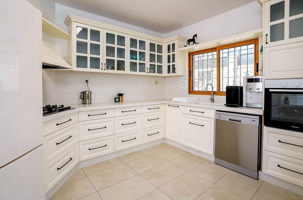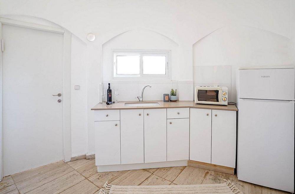 מטבח מאובזר הכולל: מקרר גדול, תנור אפייה, כיריים גז, מיקרוגל, קומקום חשמלי, מכונת אספרסו, כלי אוכל והגשה