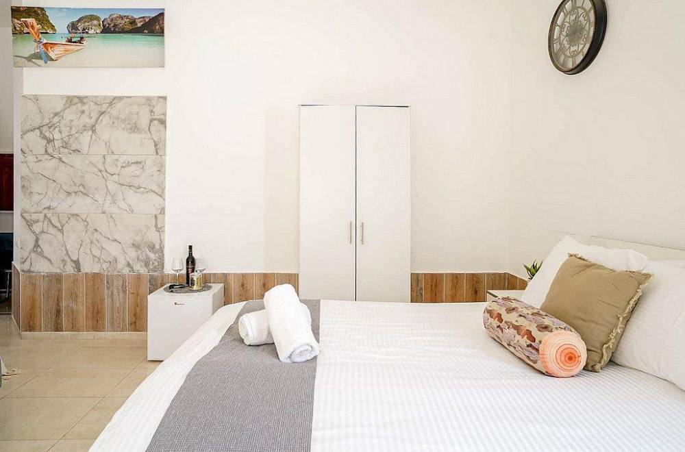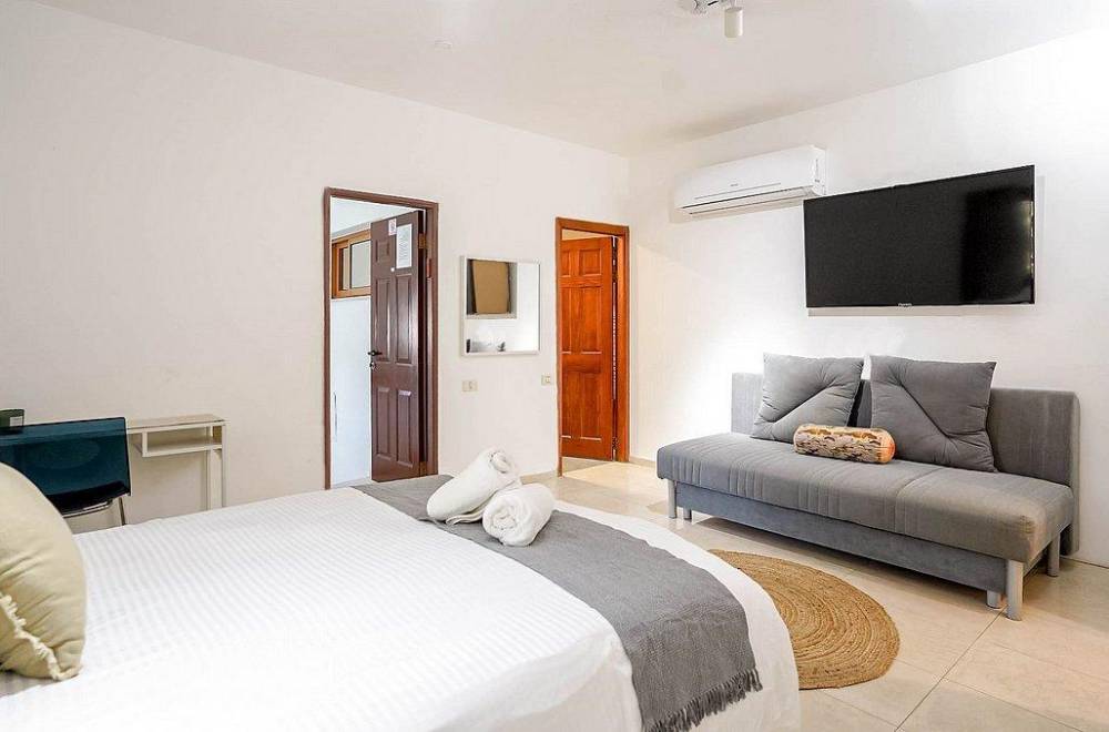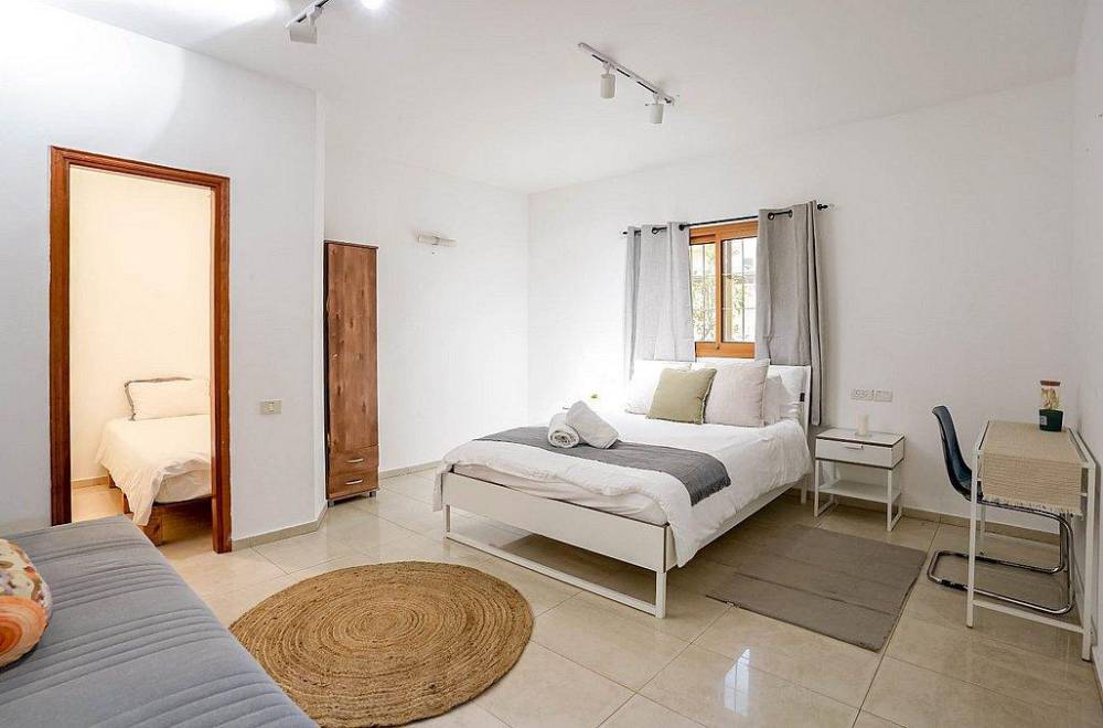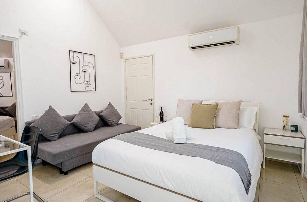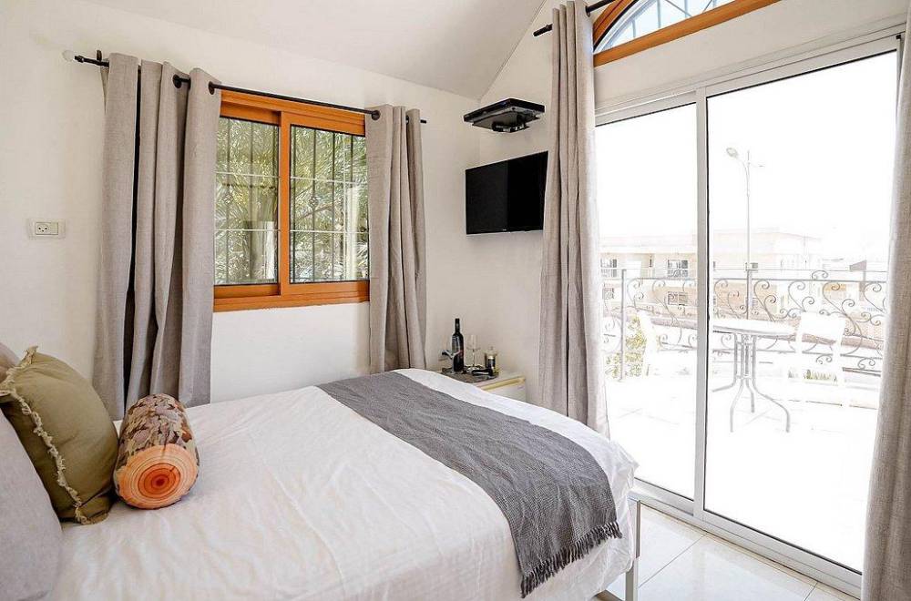 מיטה זוגית מוצעת,  מזגן, טלוויזיה, שידות, חדר רחצה פרטי, מרפסת