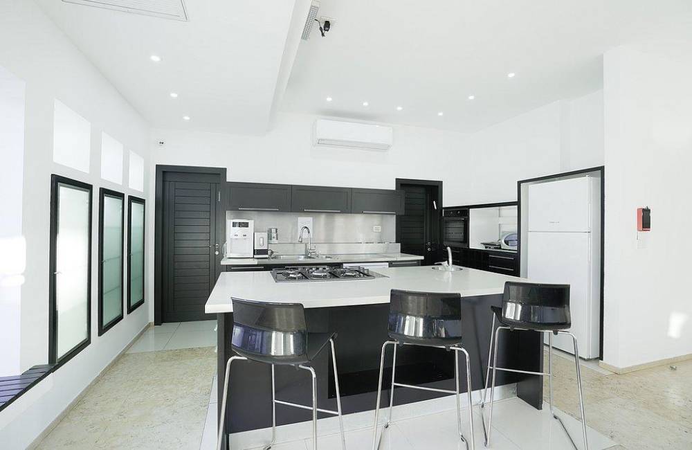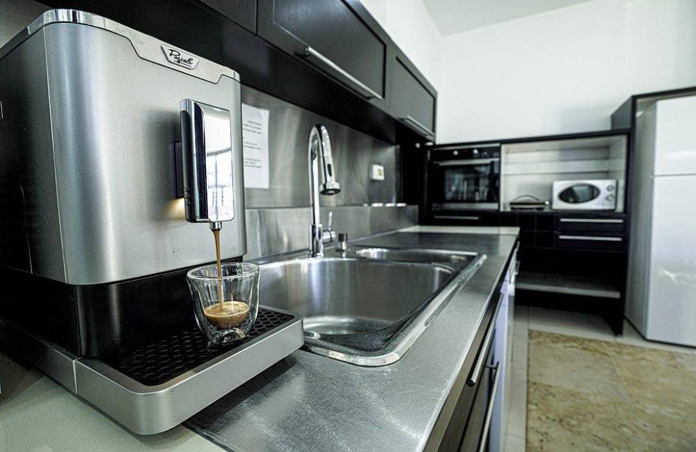 מטבח מאובזר הכולל: מיקרוגל,מקרר, תנור אפייה, מדיח כלים, קומקום חשמלי, בר מים, מכונת אספרסו, כלי אוכל והגשה