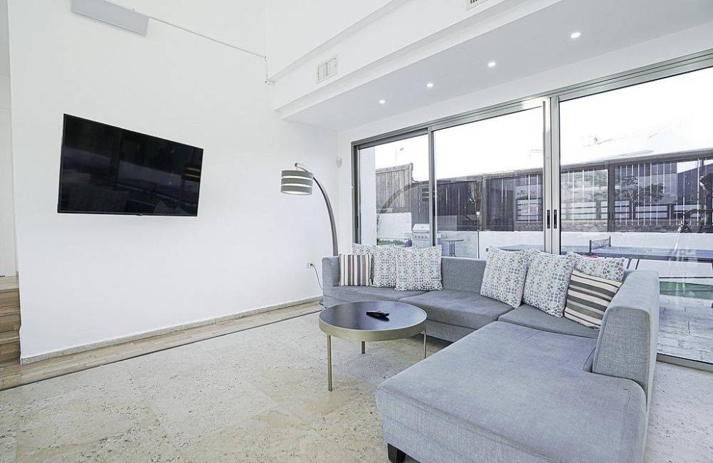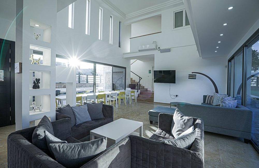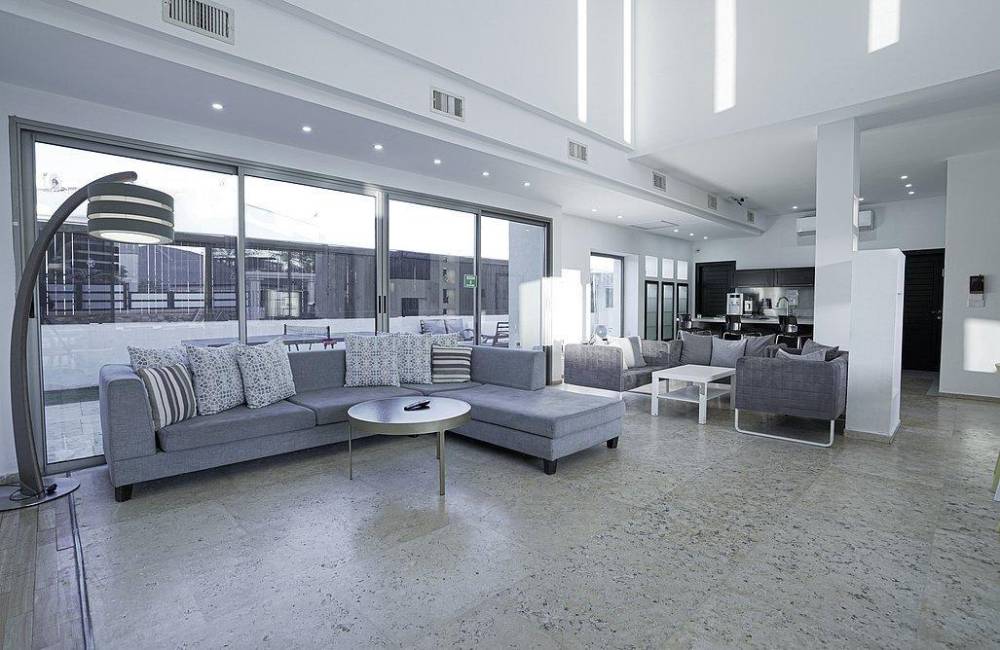 סלון מעוצב בסגנון יוקרתי הכולל פינת ישיבה ומסך צפייה עם חיבור ל-YES