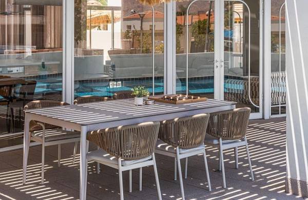 ריהוט גן מרהיב כולל מיטות שיזוף ושימשיות
