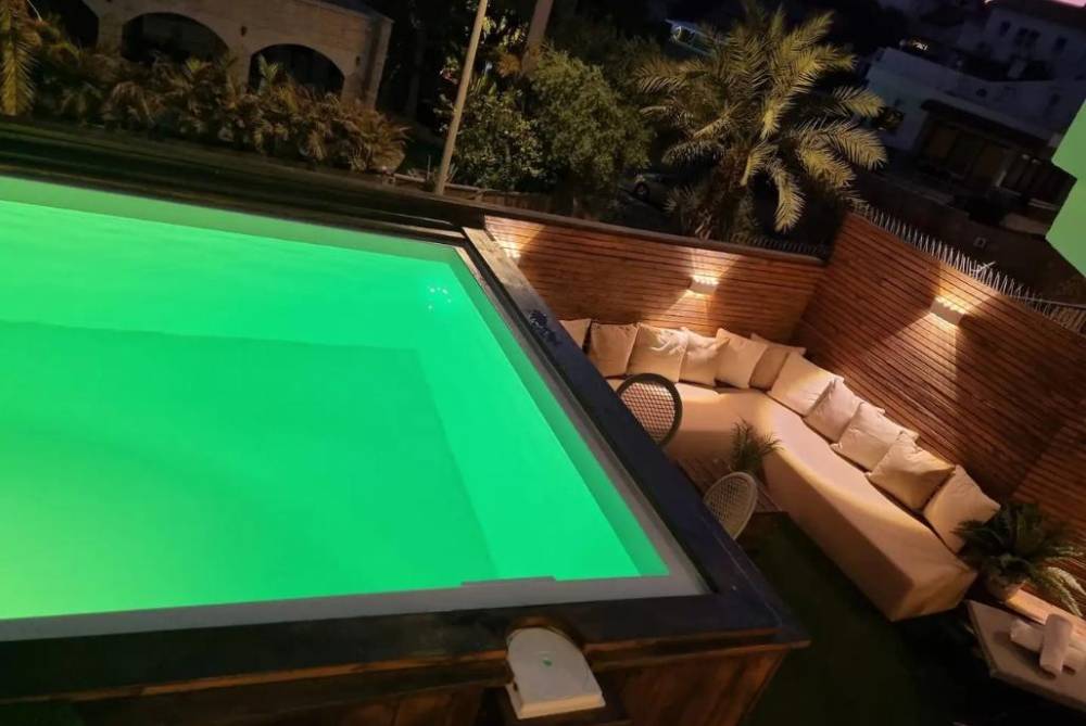 בריכת שחייה גדולה עם מיטות שיזוף ופינות ישיבה