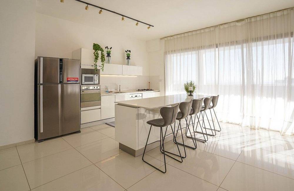 מטבח מאובזר ובו: מקרר, מיקרוגל, תנור, כיריים גז, כלי אוכל והגשה