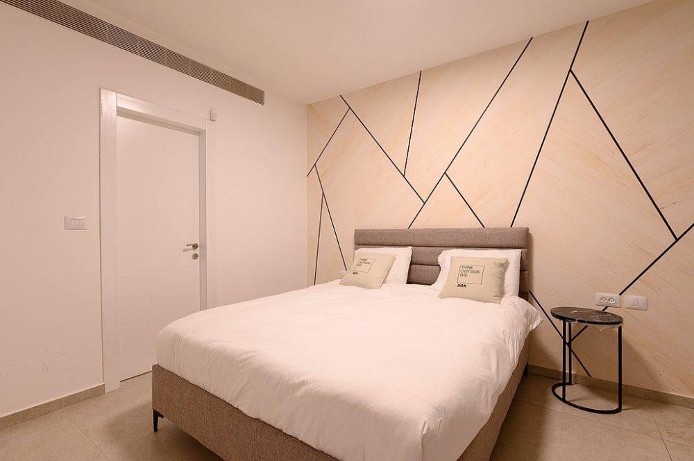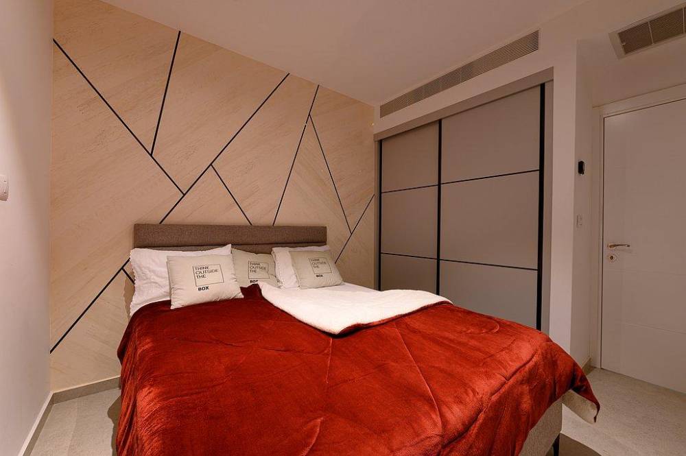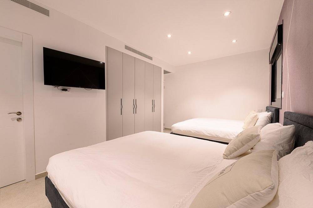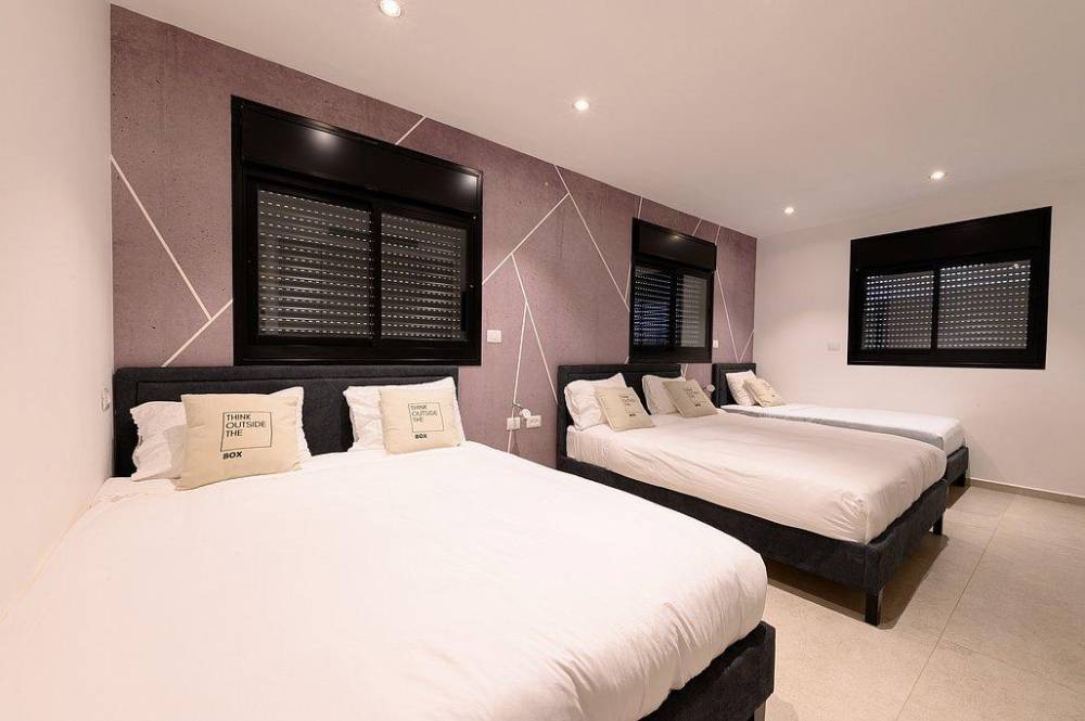 כל חדר מאובזר במיטה זוגית עם מזרן אורטופדי, שידות וארונות לאחסון, מסך טלויזיה ומיזוג אוויר