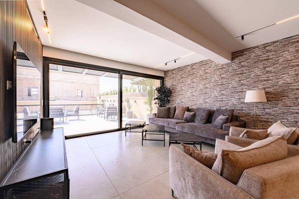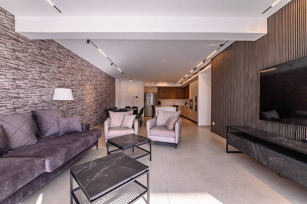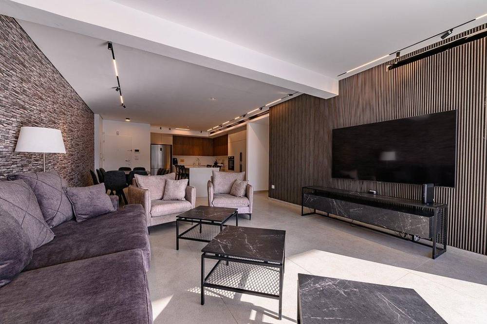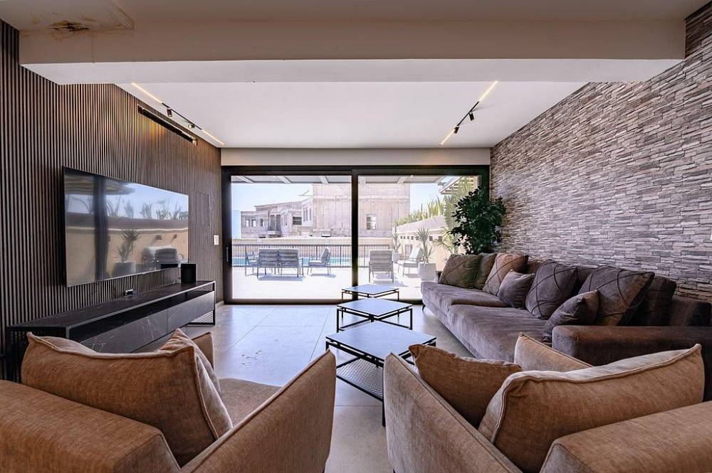 סלון מרווח הכולל מערכת ישיבה מפנקת ומסך טלוויזיה smart tv