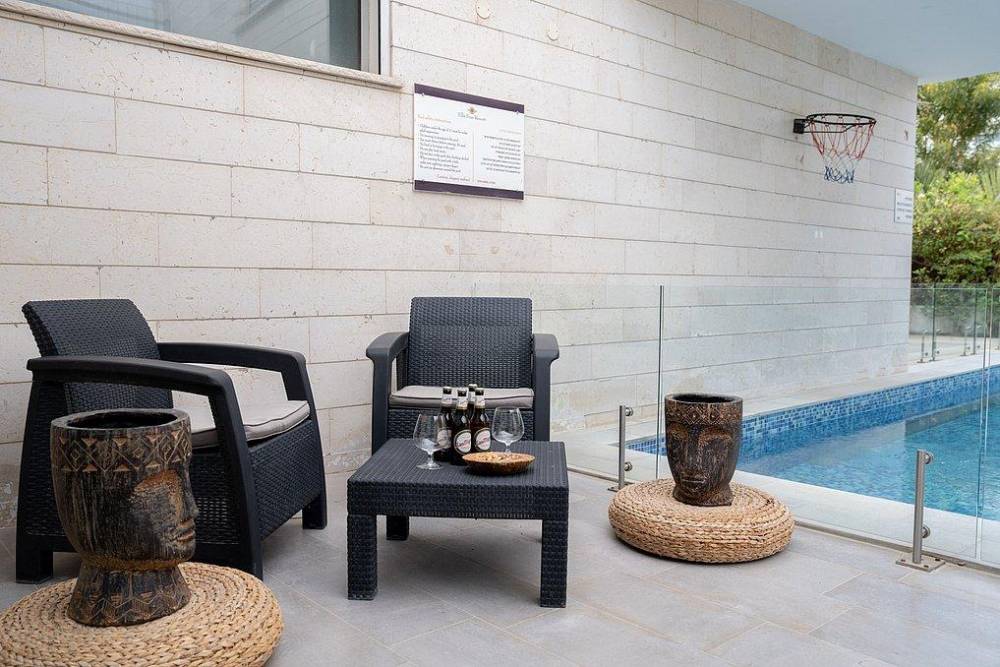 לכל וילה מתחם חיצוני מבודד ופרטי לגמרי עם בריכת שחייה מחוממת עם גדר לבטיחות, סאונה יבשה מפנקת, ג'קוזי ספא ועוד..