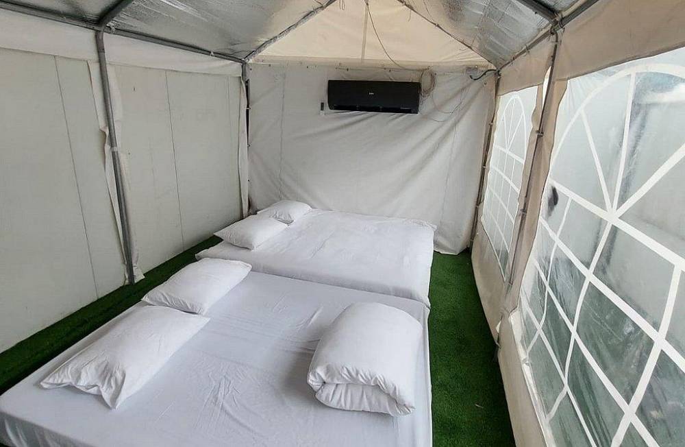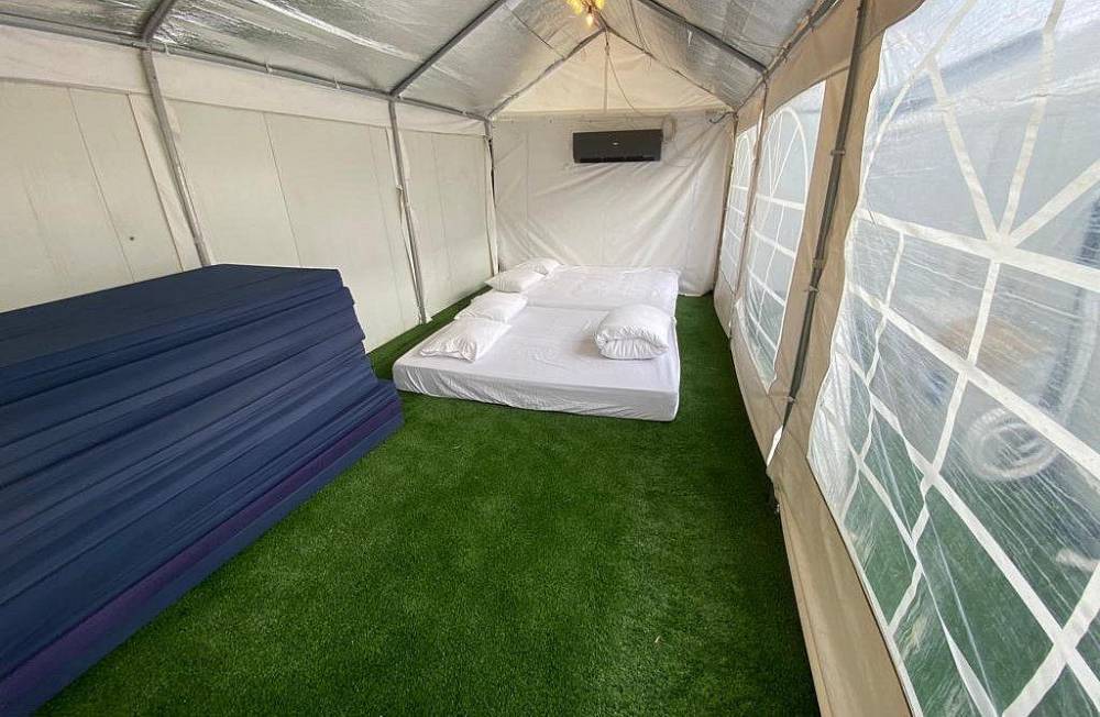 אוהל ממוזג המשמש ללינה וכולל בתוכו מזרנים מוצעים