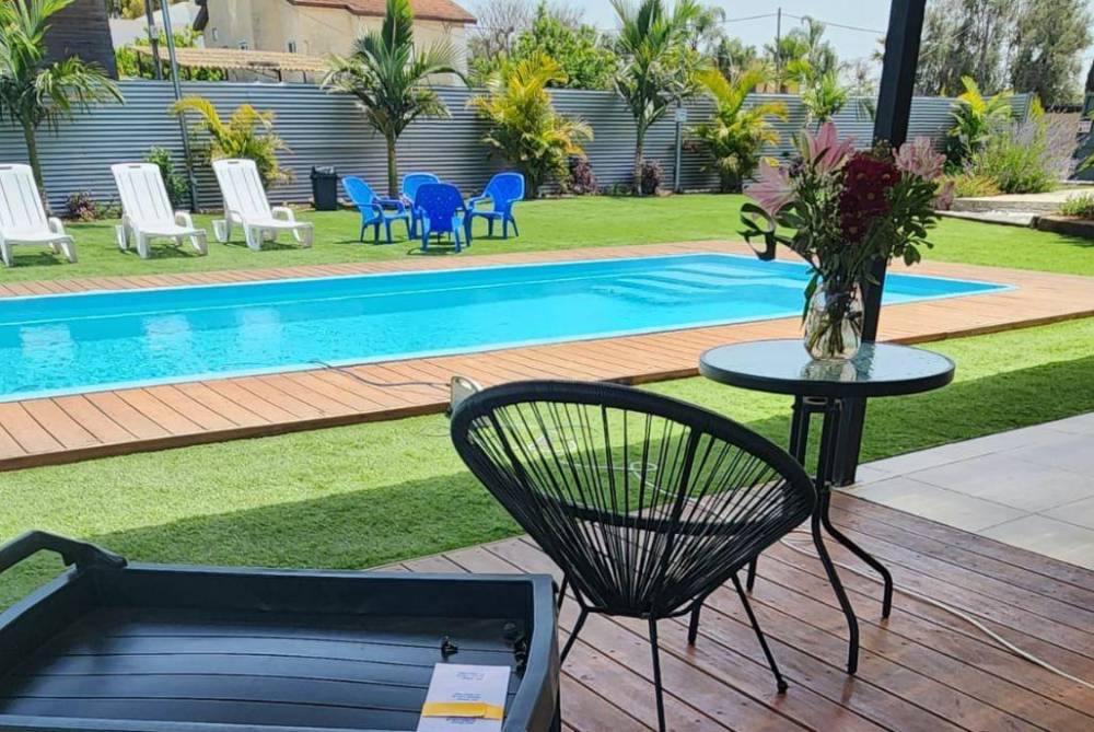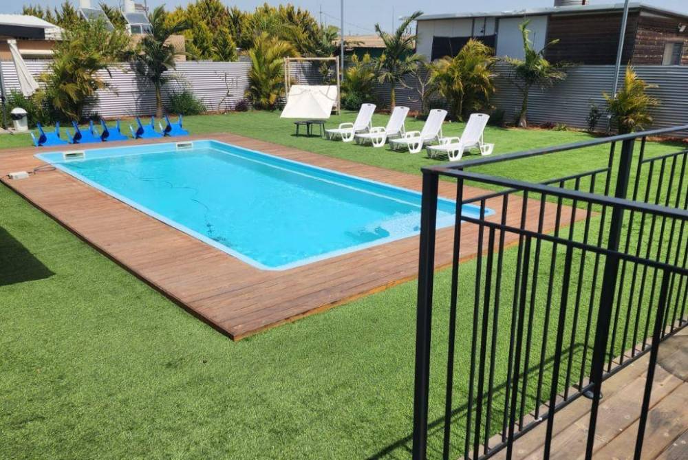בריכת שחייה גדולה ומחוממת, סביב הבריכה מדשאות ואזורי שיזוף