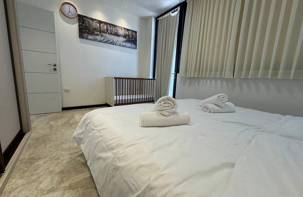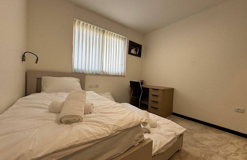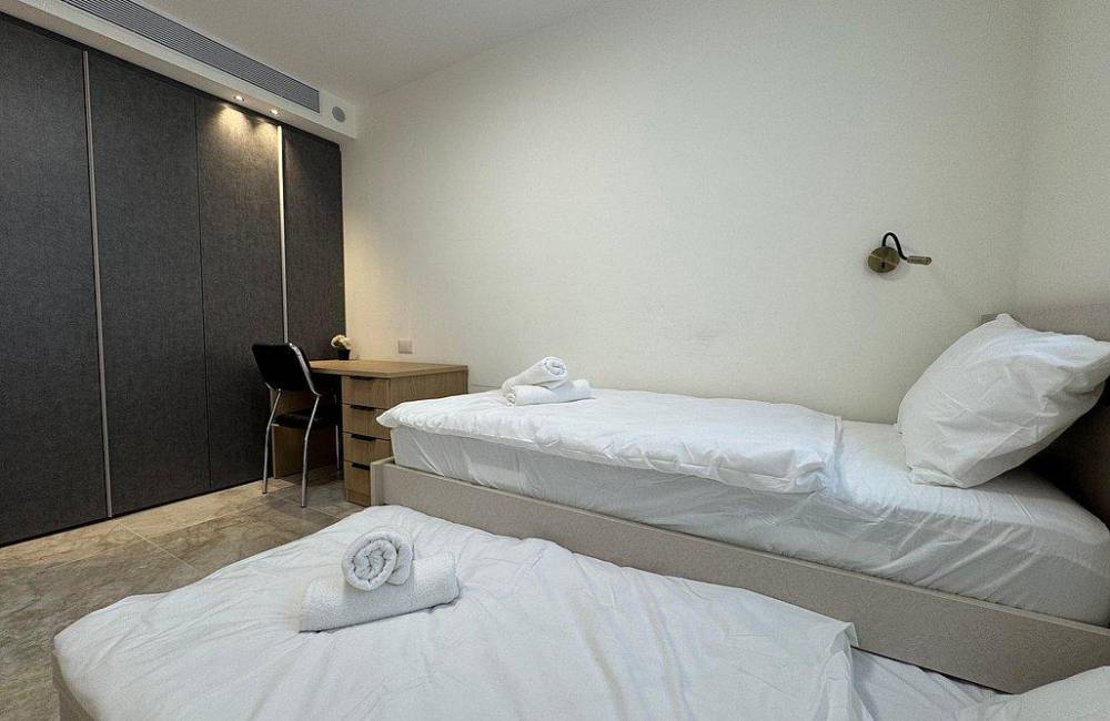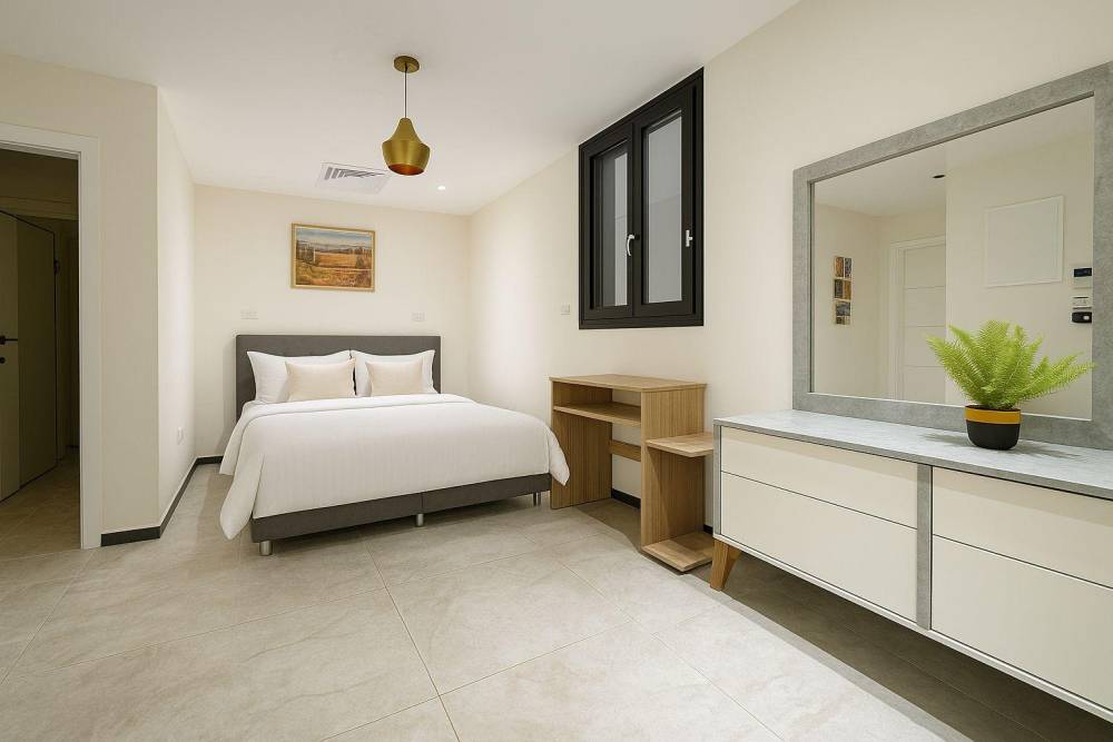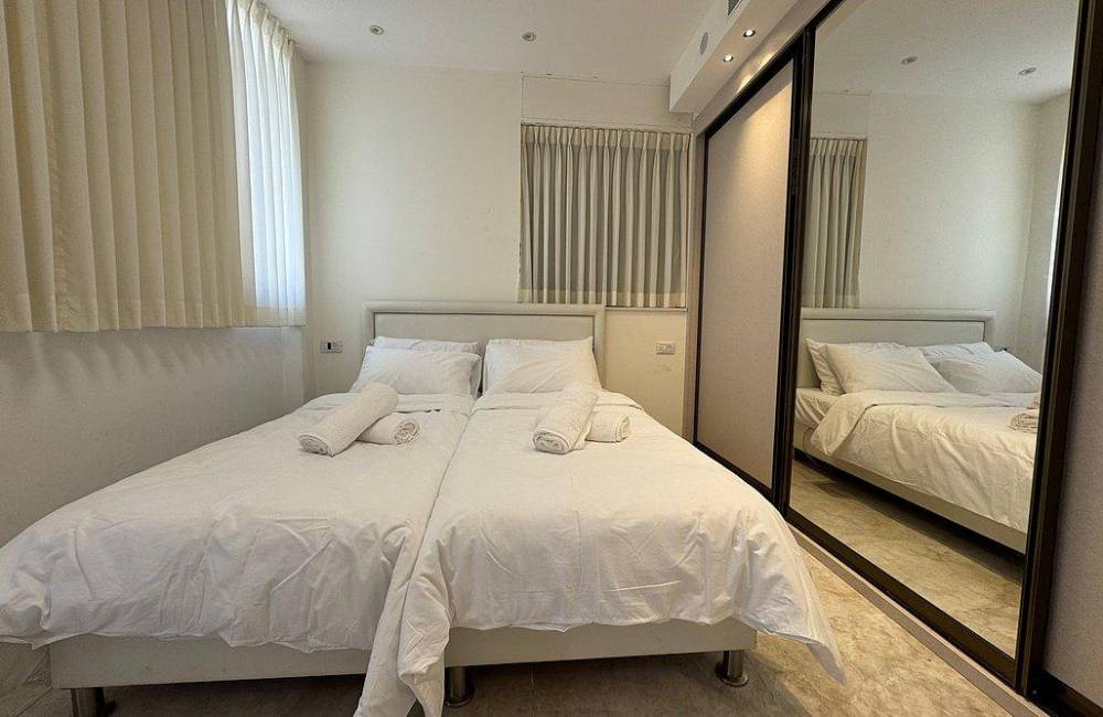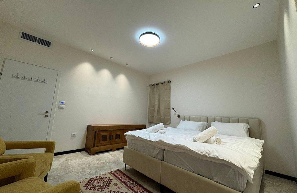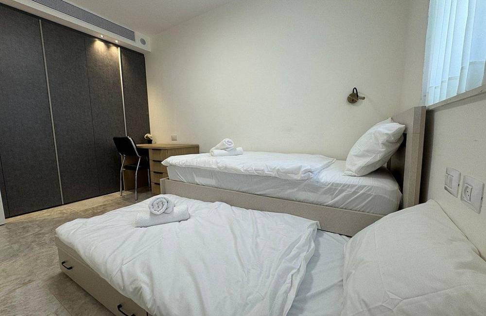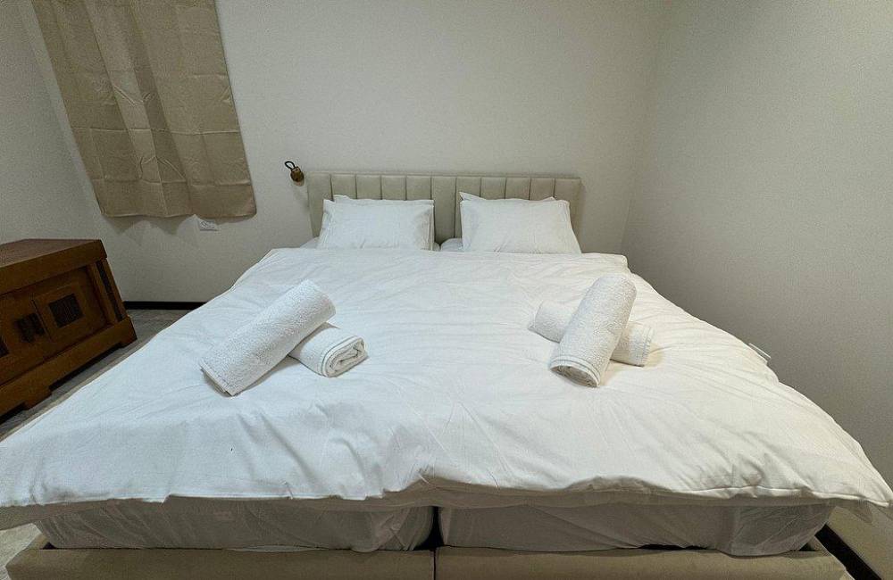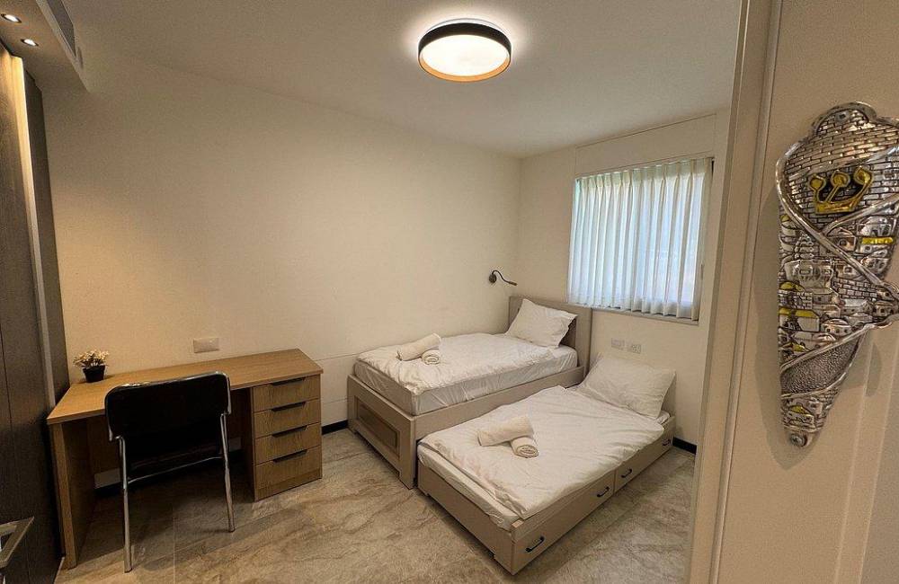 קומה רביעית: 2 חדרי שינה, כל חדר שינה עם מיטה יהודית, מיזוג אוויר, שידות וארונות לאחסון, שירותים ומקלחת משותפים