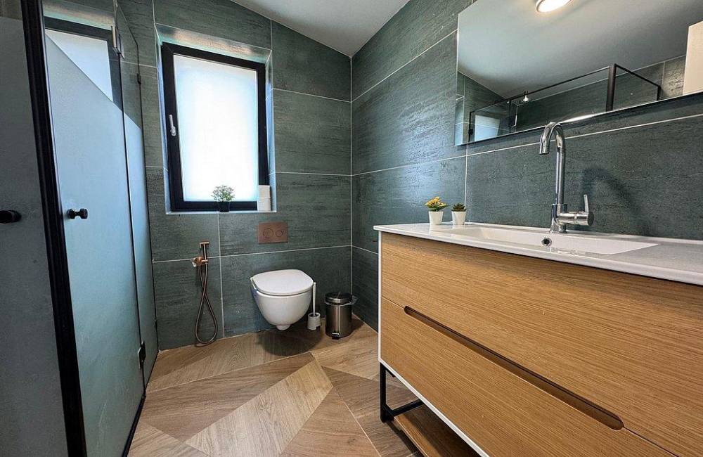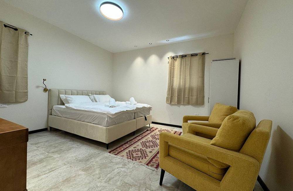 קומה ראשונה: 2 חדרי הורים כל אחד עם מיטה יהודית וחדר ילדים, חדר רחצה צמוד, מיזוג אוויר, שידות וארונות לאחסון