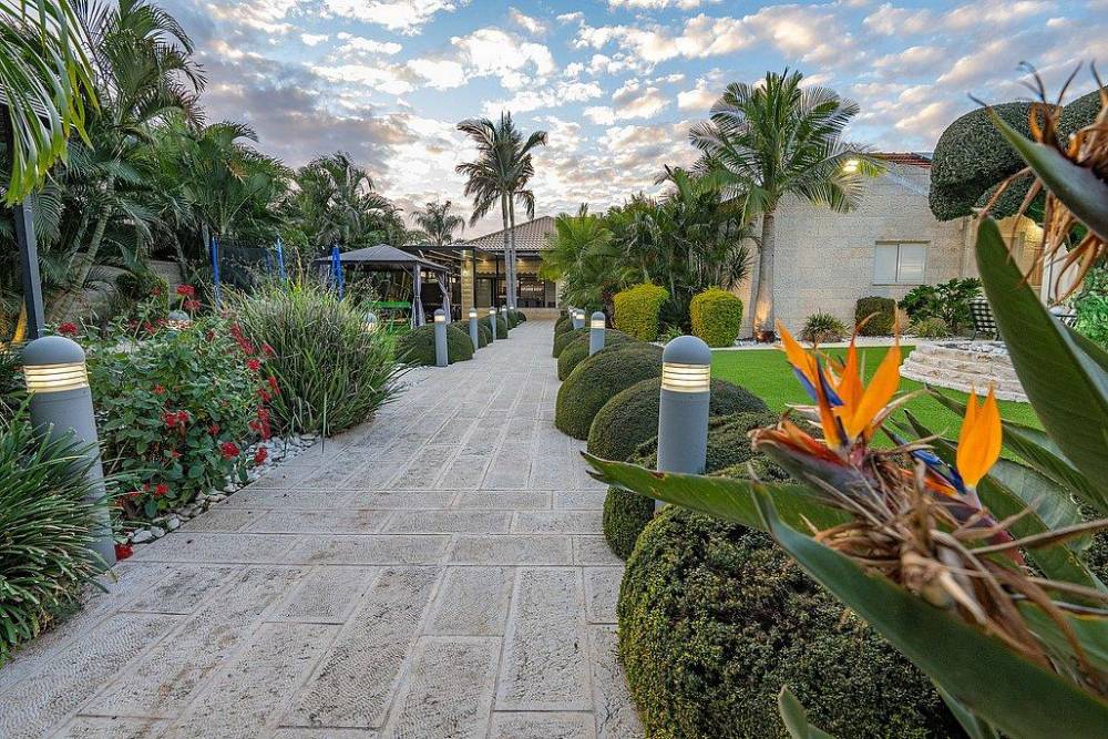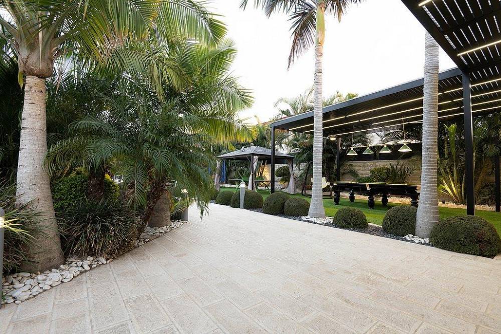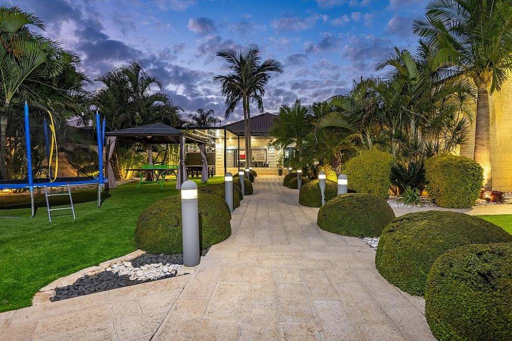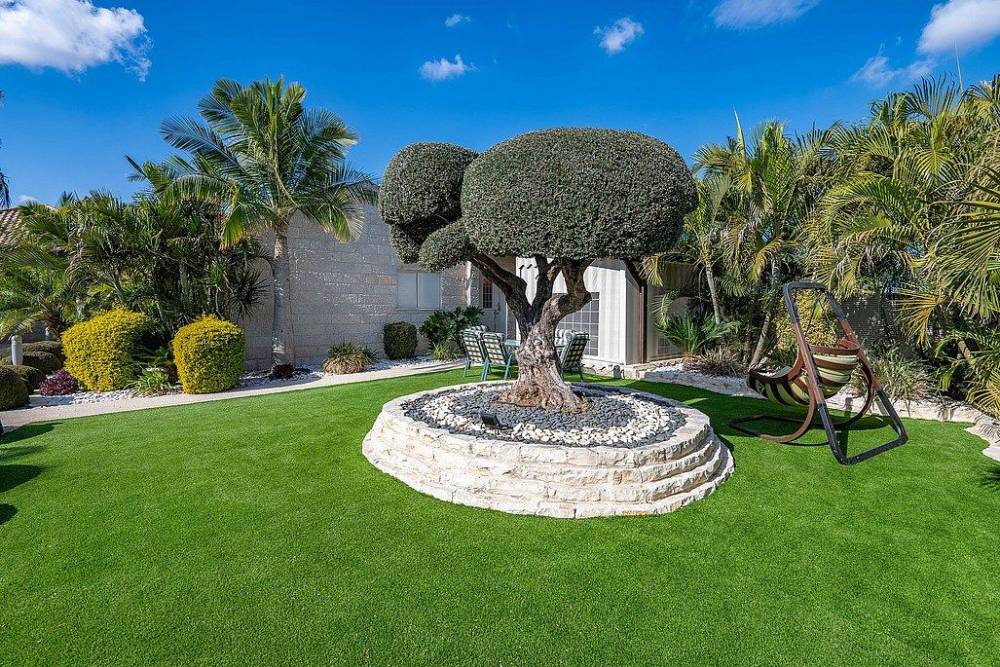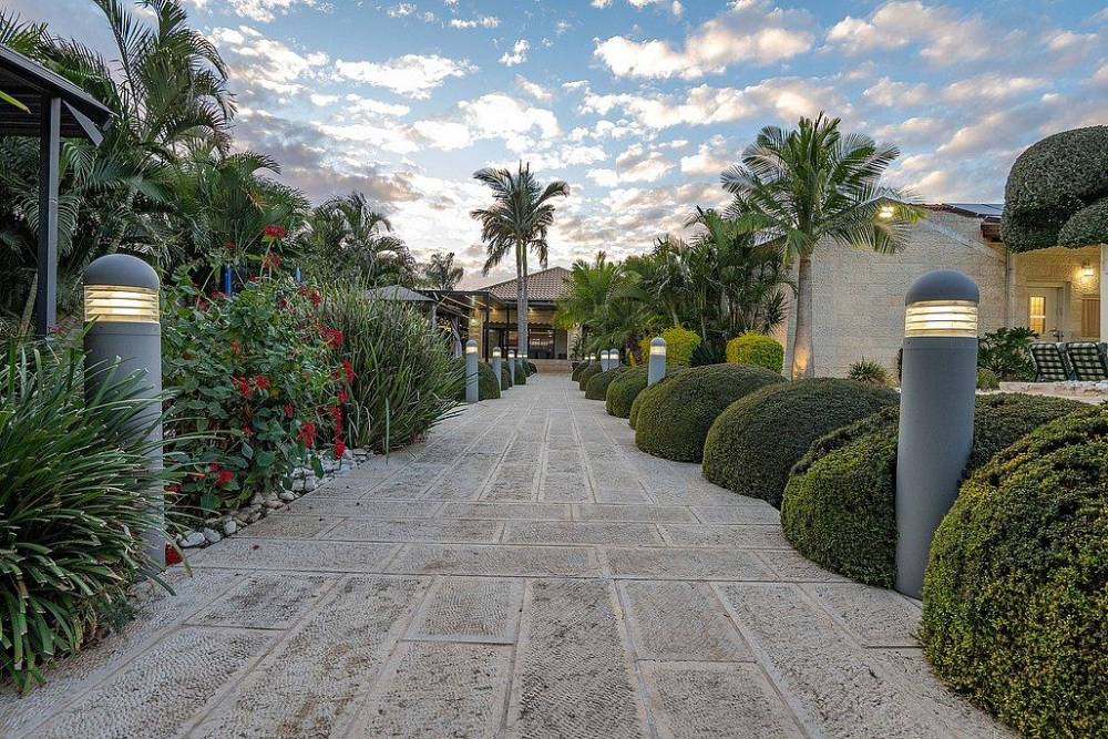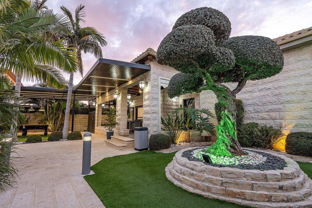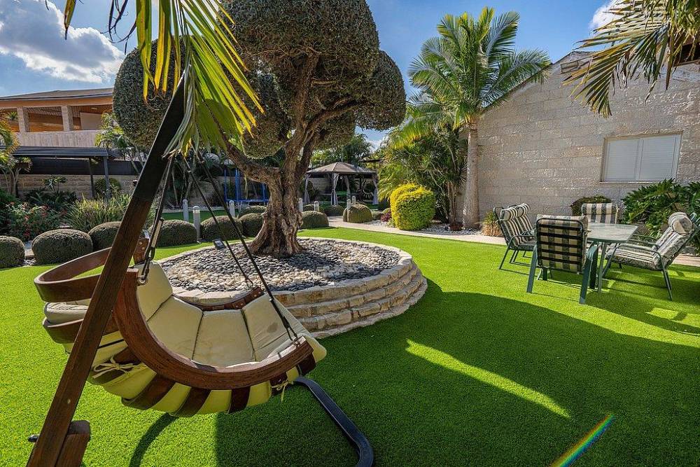 חצר מרשימה עם מרחבי דשא ועצי נוי