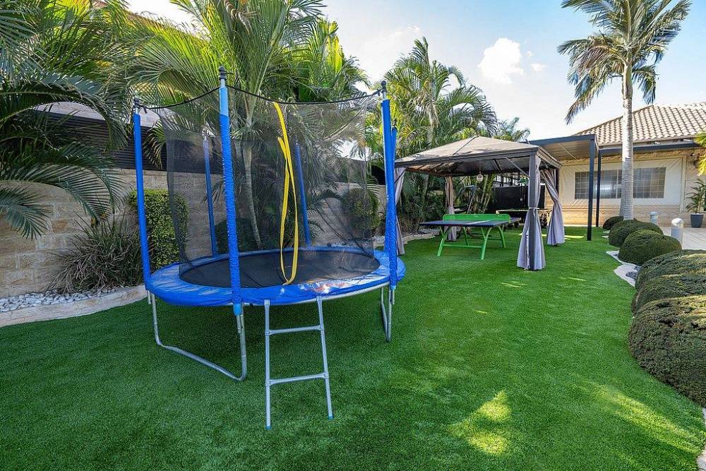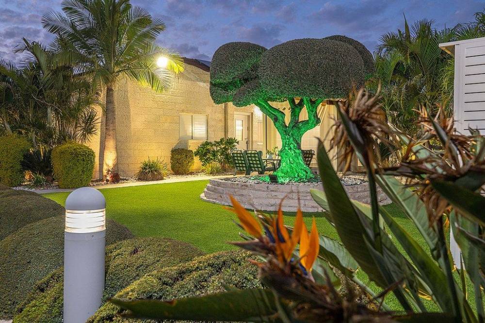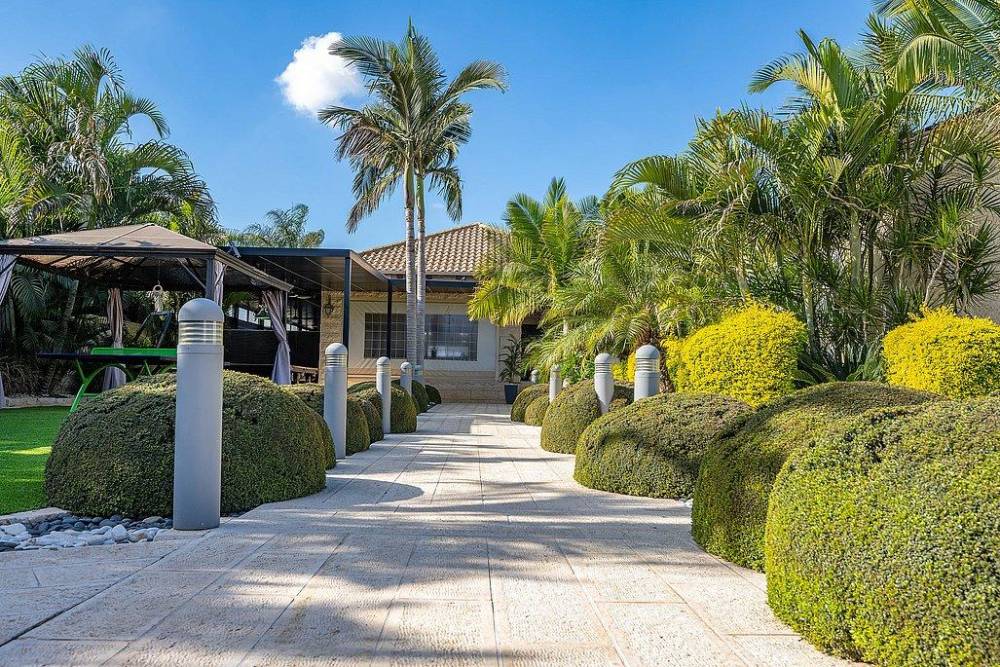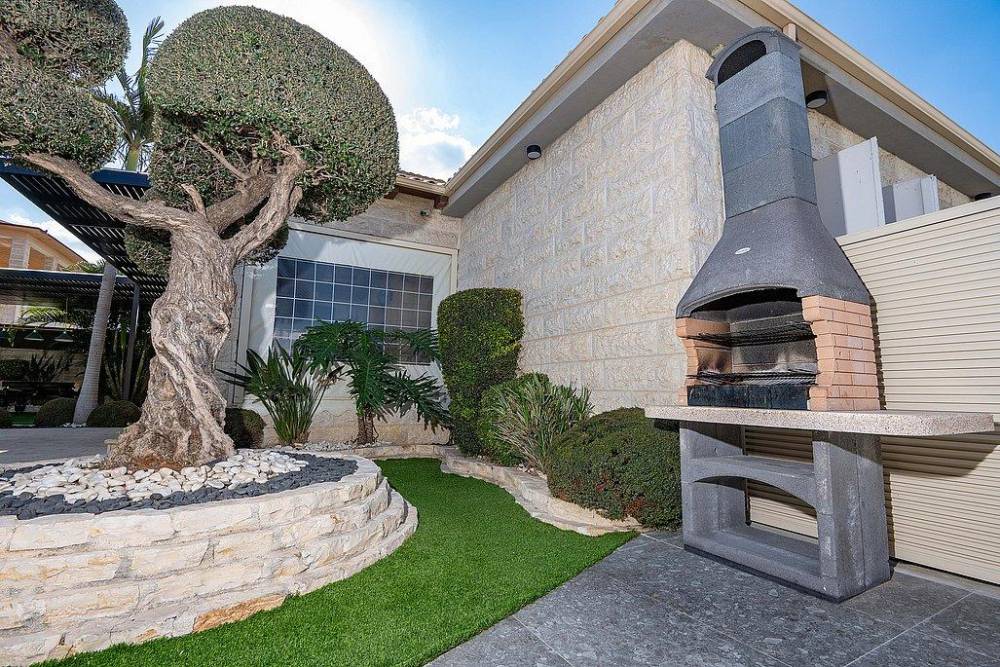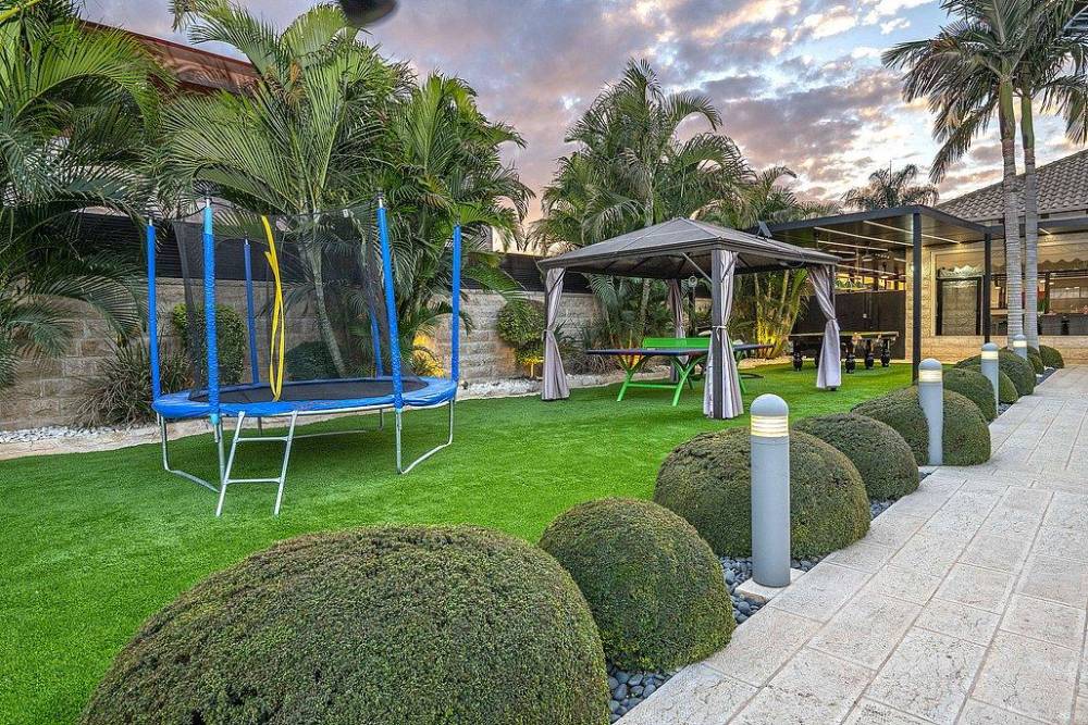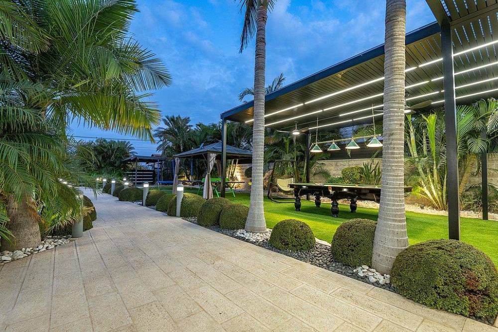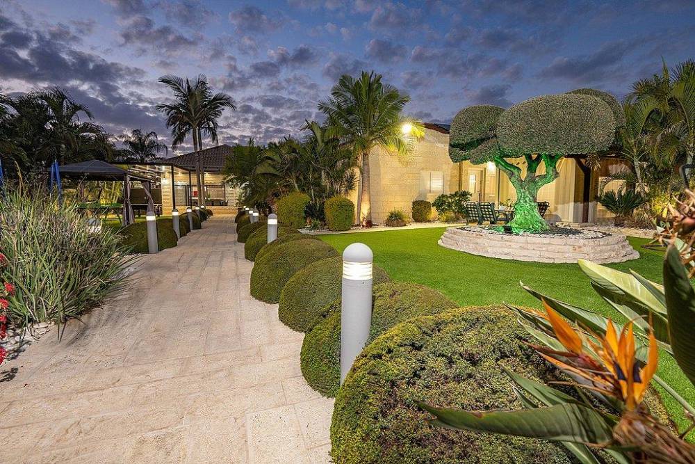 חצר מרשימה עם מרחבי דשא ועצי נוי