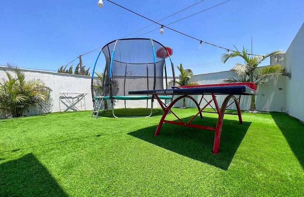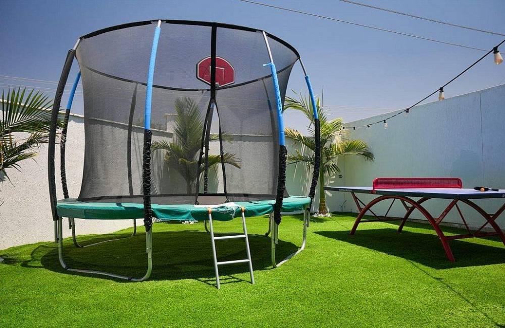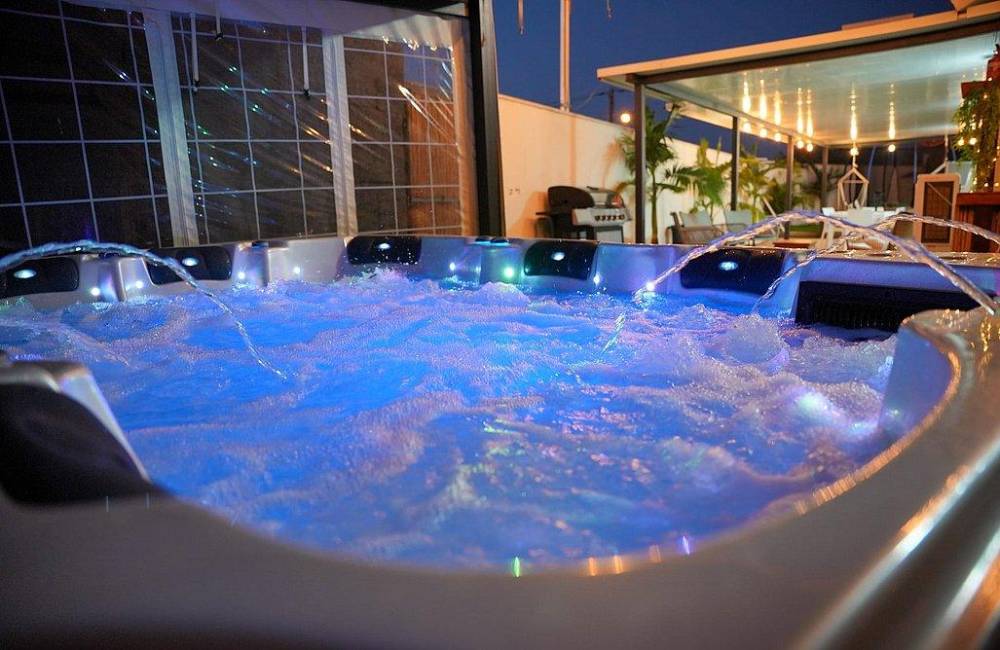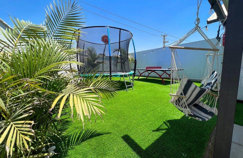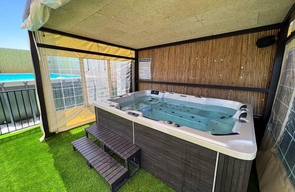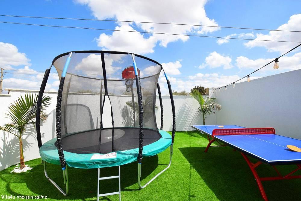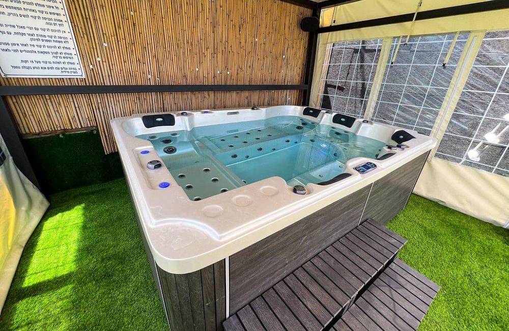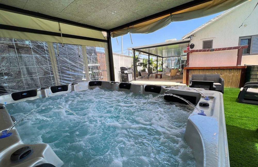 בחוץ חצר מדהימה, בריכה גדולה ונקייה, משחקים, וג'קוזי מטורף.
