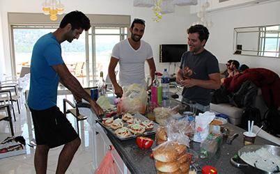 מטבח מאובזר הכולל: מקרר זכוכית ענק, מתקן לשתייה, מיקרוגל, קומקום חשמלי וכיריים גז