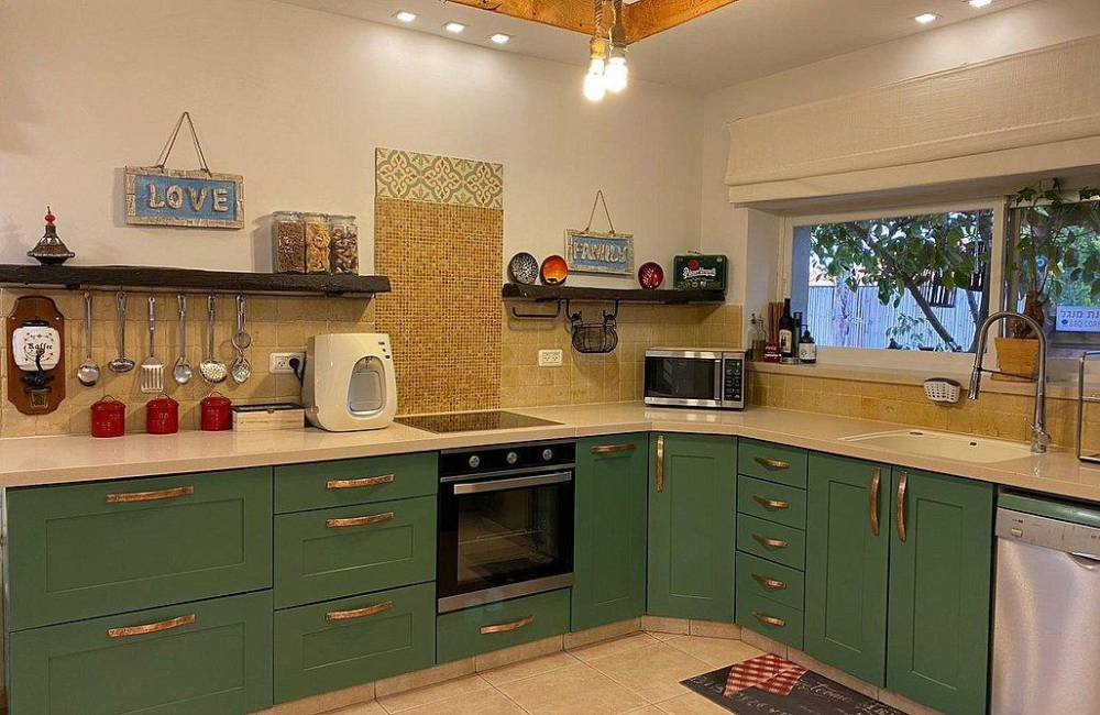 מטבח מאובזר ובו: מקרר גדול, תנור אפייה, מיקרוגל, טוסטר, כיריים חשמליות, בר מים, כלי אוכל והגשה