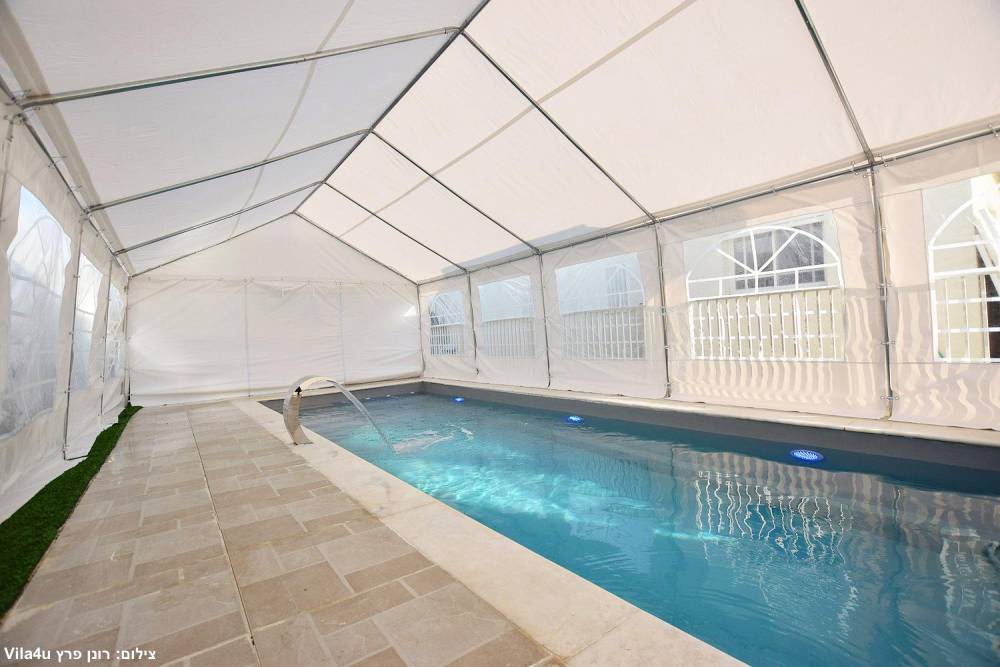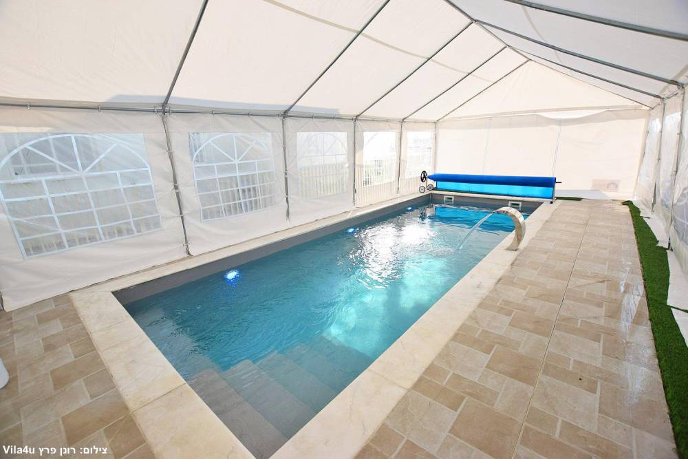 בריכת שחיה מחוממת ומקורה עם מפל מים