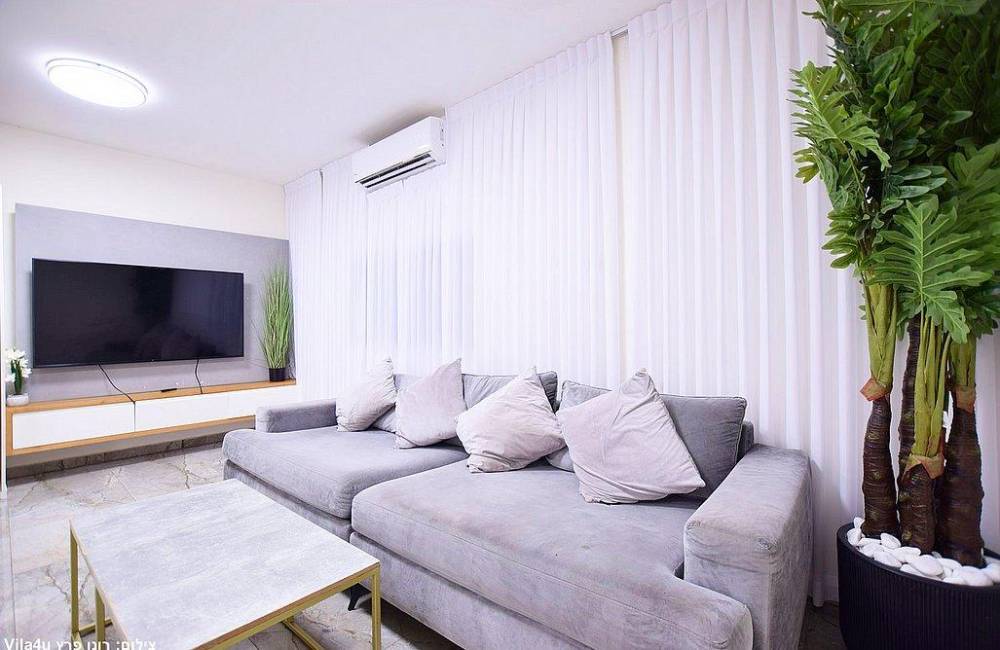 סלון מעוצב עם מערכת ישיבה ומולה טלוויזיה עם חיבור ל-HOT