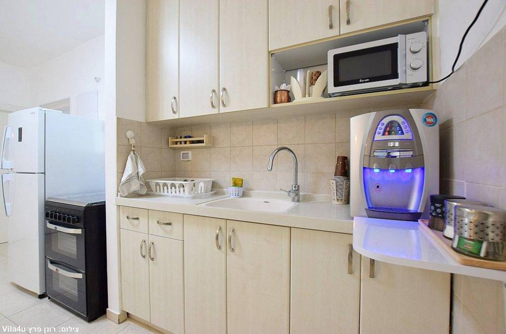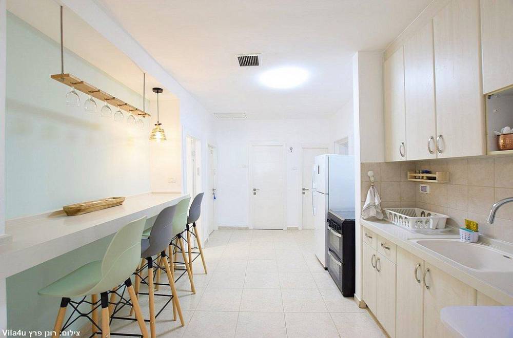 מטב הוילה מאובזר ב- 2 מקררים, מיקרוגל, פלטה ומיחם, מכונת קפה, מתקן מים מותאם לשבת, כלי אוכל והגשה