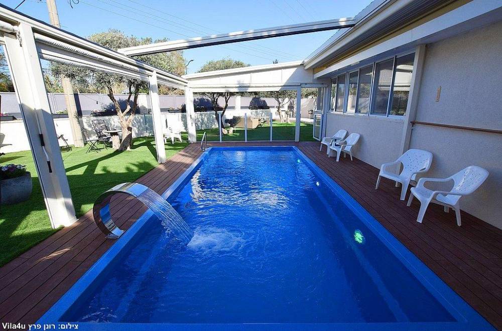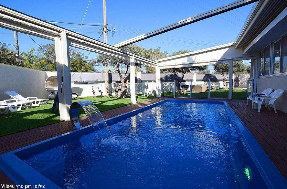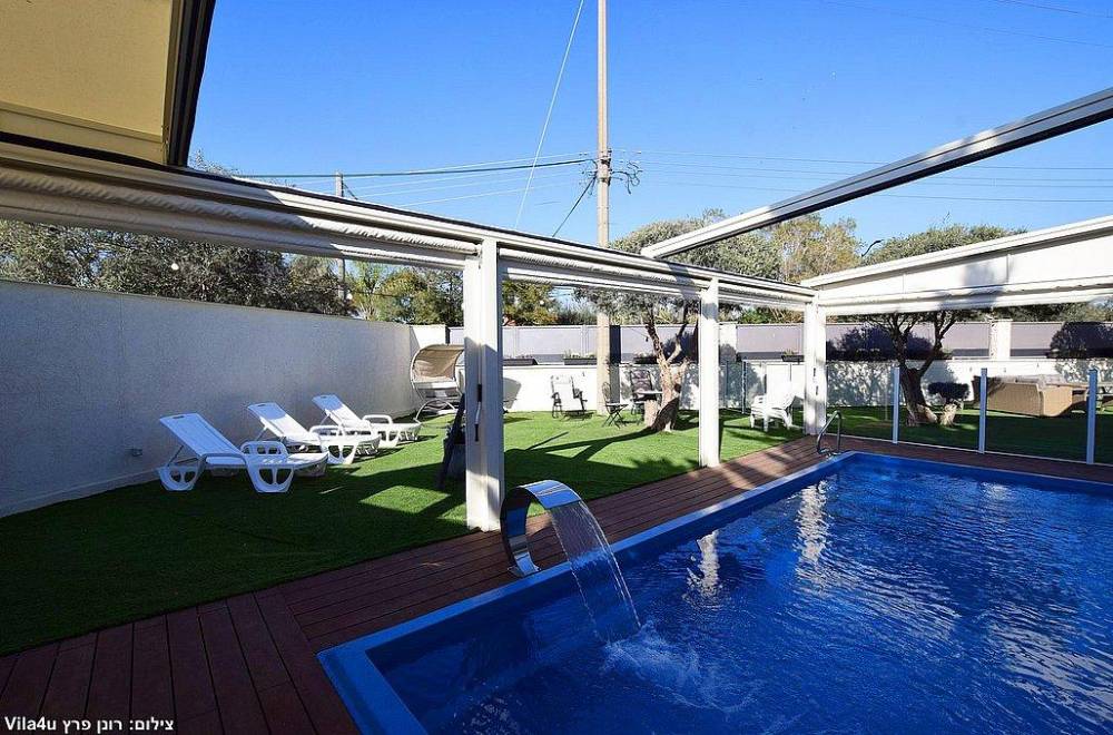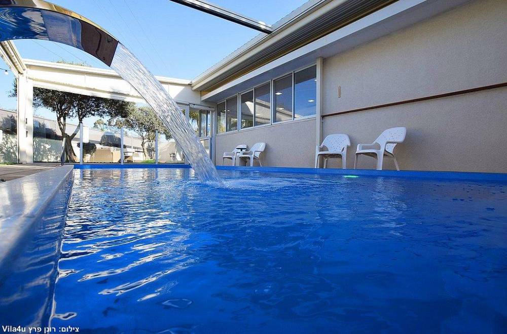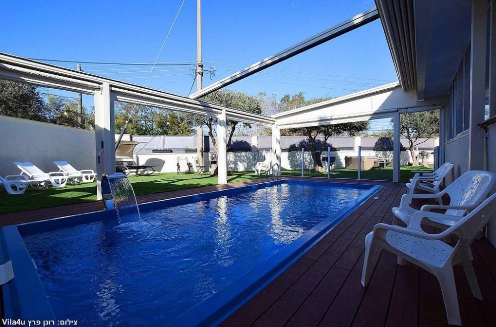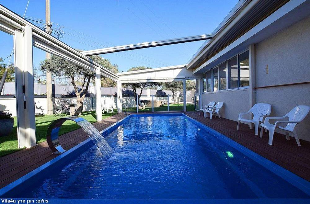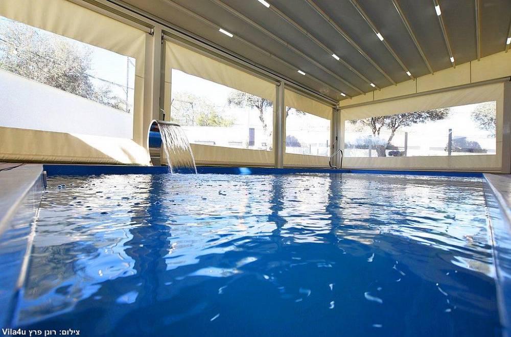 בריכת שחייה בגודל 7X3  עם מפל מים, הבריכה מחוממת מקורה בחודשי החורף וכוללת סוכך חשמלי נפתח ונסגר