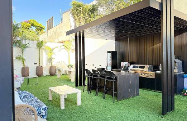 מטבח חוץ עם מקרר, מקפיאים, מכונת קרח ומכונת ברד