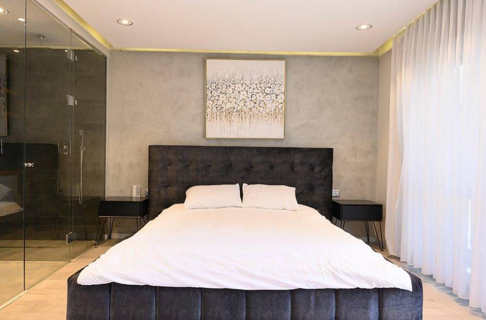 חדר שינה > מיטה זוגית קינג סייז, טלוויזיה בגודל 50 אינץ עם חיבור לHOT, מזגן, שידות לאחסון וקומודה.