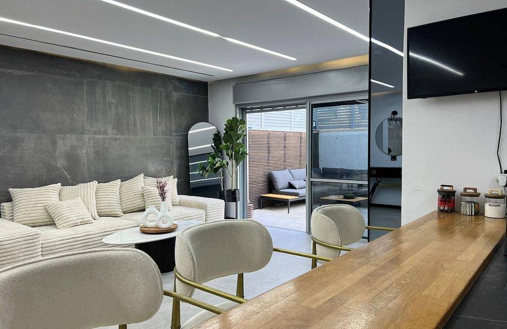 סלון רחב ידיים ובו מסך בגודל 80 אינץ עם חיבור לHOT