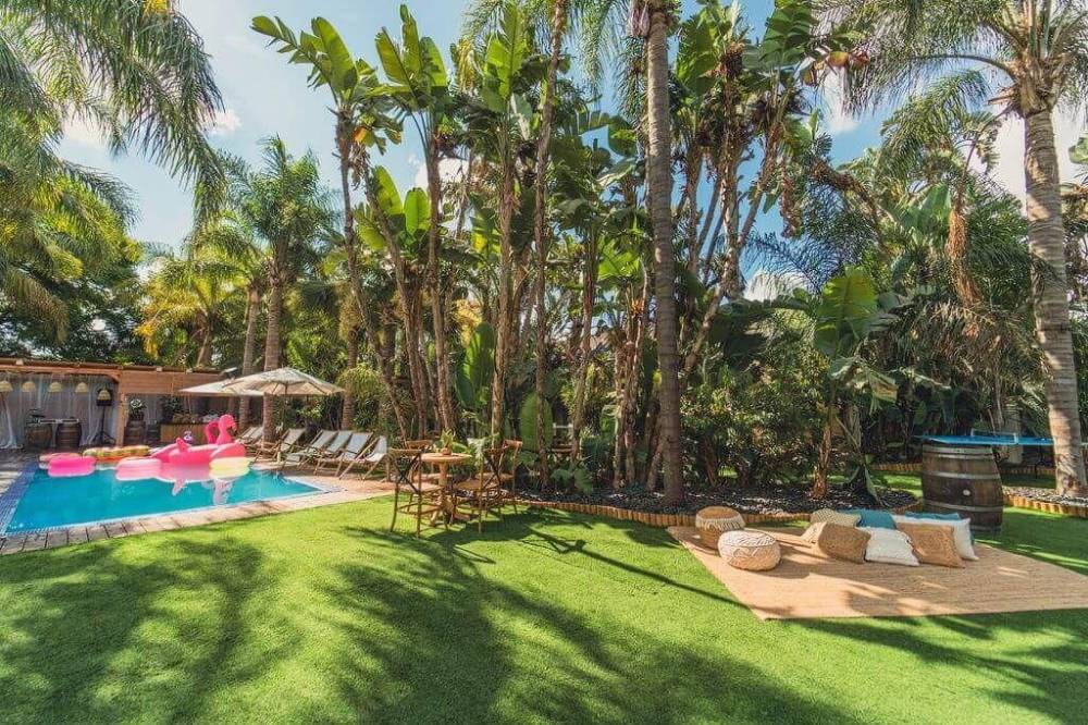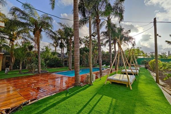 - מדשאות ירוקות, עצי דקל ובמבוקים