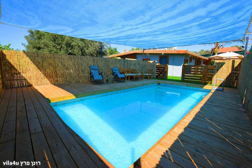 חצר מרווחת עם מדשאה ובריכת שחיה מחוממת מחופה דק עץ ומגודרת גודל הבריכה 8 על 4
