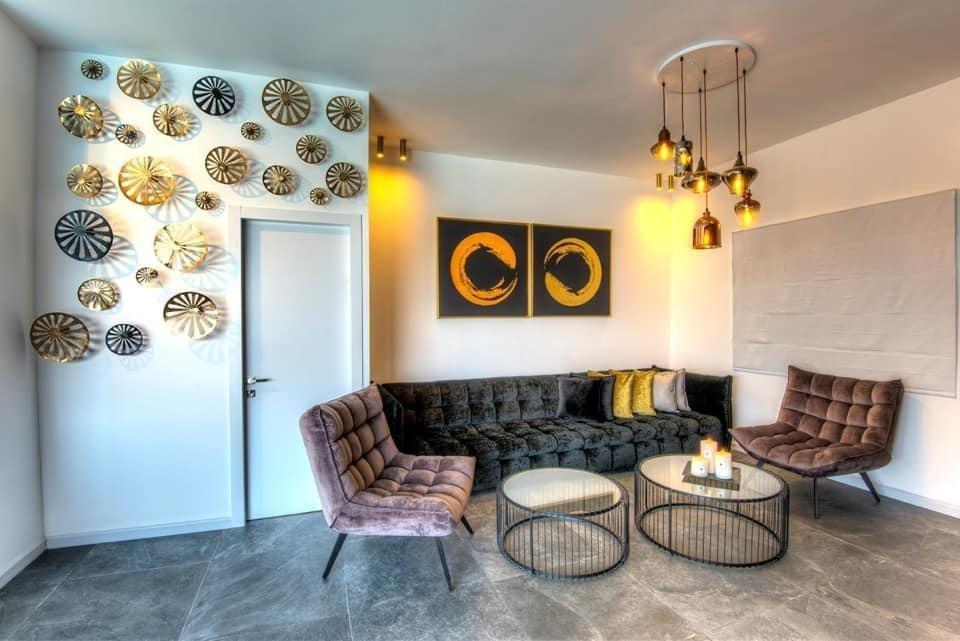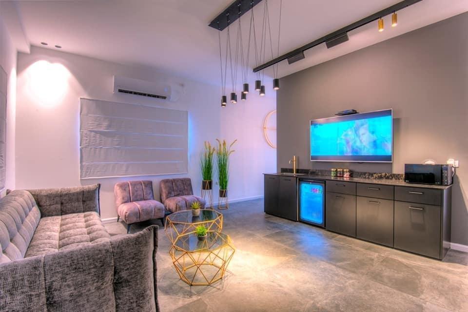 סלון יוקרתי ומודרני עם מערכות ישיבה איכותיות, תאורה מדהימה ומסך טלוויזיה
