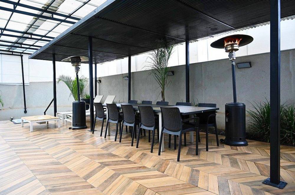 כל המתחם פונה לעבר הבריכה תחום בוויטרינות גדולות ומרשימות המשקיפות על החצר כולה