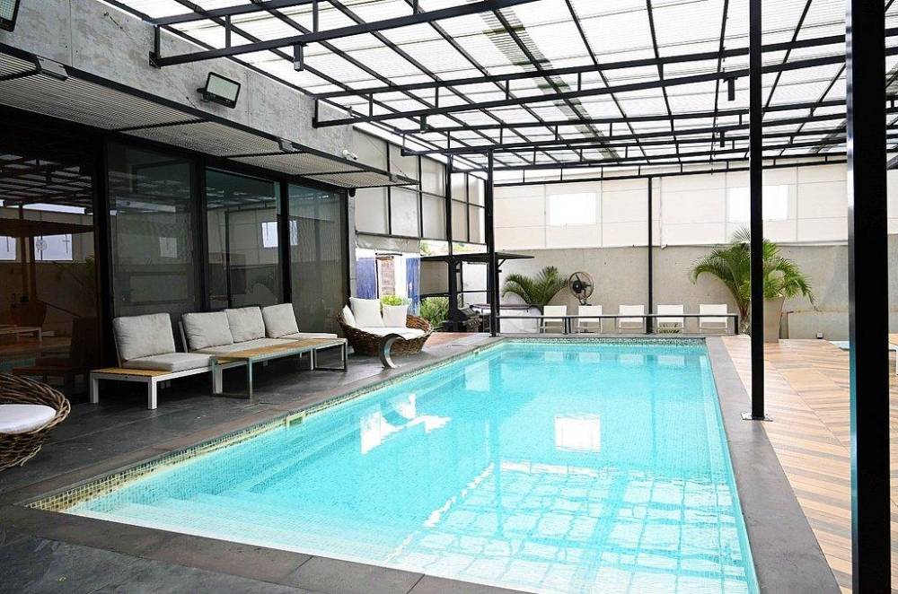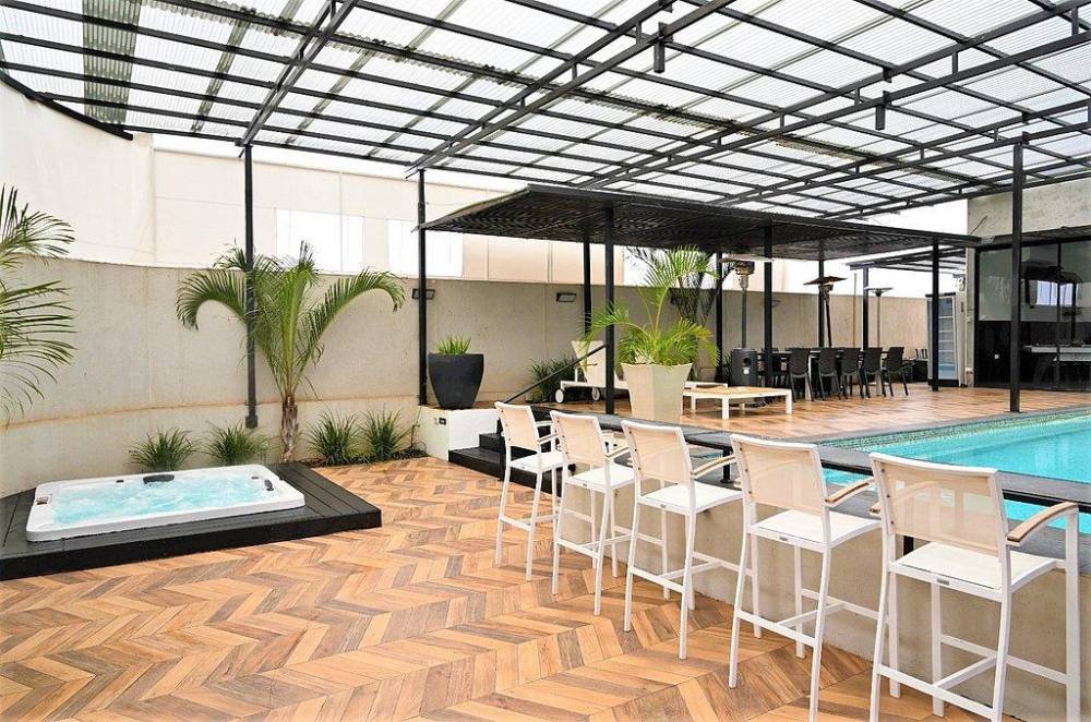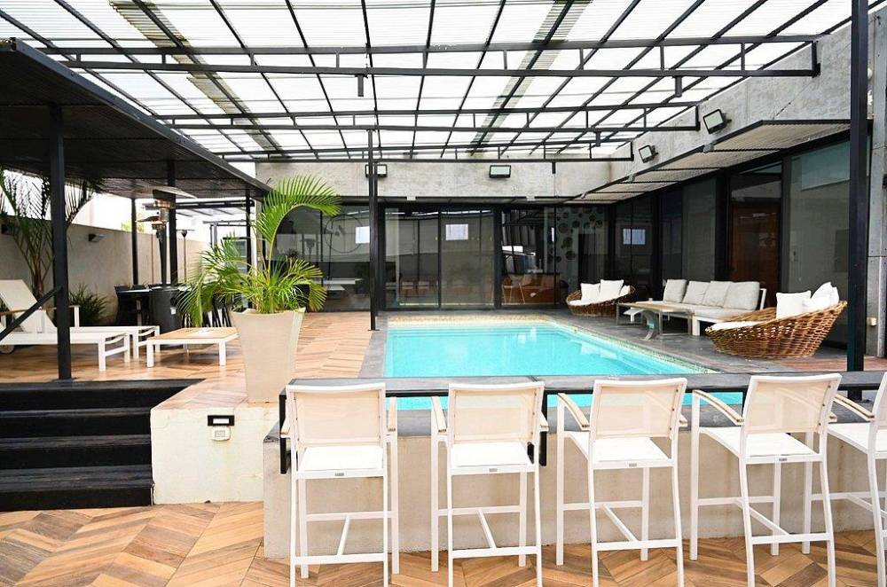 בר מובנה עם כיסאות ישיבה גבוהים מול הבריכה