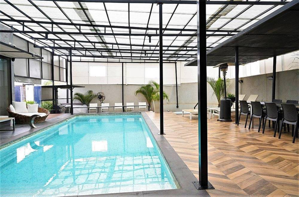 חצר יפיפייה עם מדשאות, בריכת שחייה מחוממת, מקורה ומקצועית מחופה דק עץ מדהים