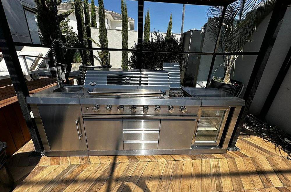 מטבח חוץ הכולל כיור, מקררים, מקפיא ועמדת ברביקיו מסודרת