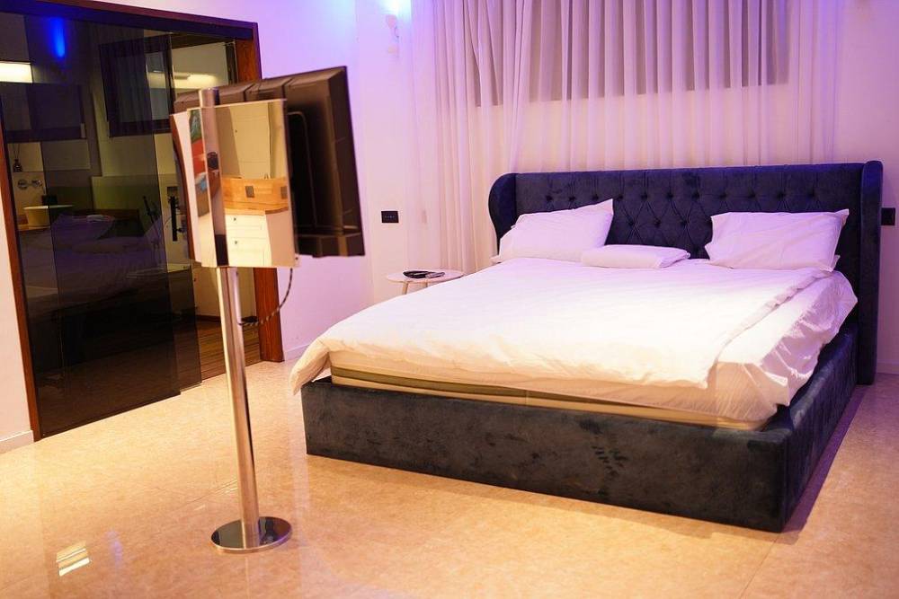 מיטה זוגית מוצעת, מיזוג אוויר, שידה, פינת ישיבה וחדר רחצה עם שירותים, בידה, ואמבטיה