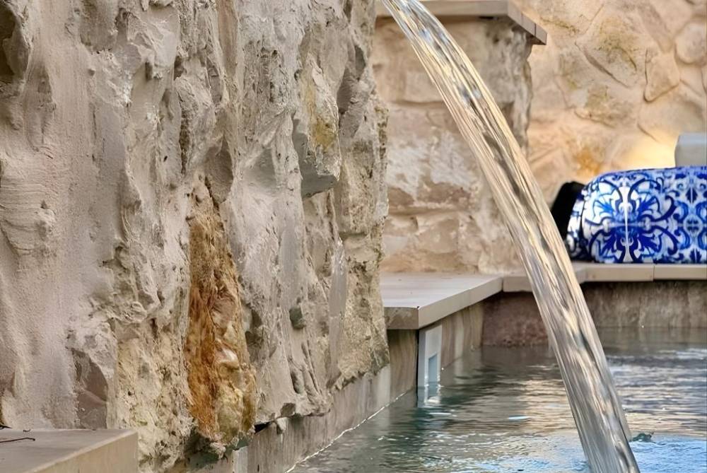 בריכת שחיה מחוממת ומגודרת עם מפל מים ופינות שיזוף