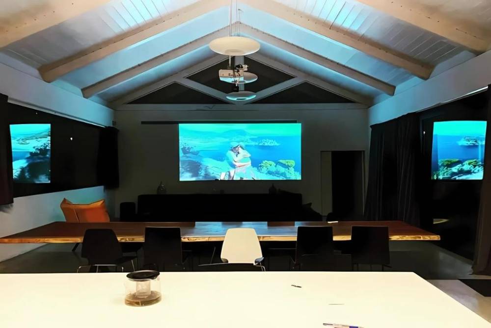 סלון מעוצב הכולל מערכת ישיבה מפנקת, פינת אוכל מרווחת, בר שולחני יוקרתי עם כיסאות גבוהים, מקרן, ומערכת שמע מתקדמת!