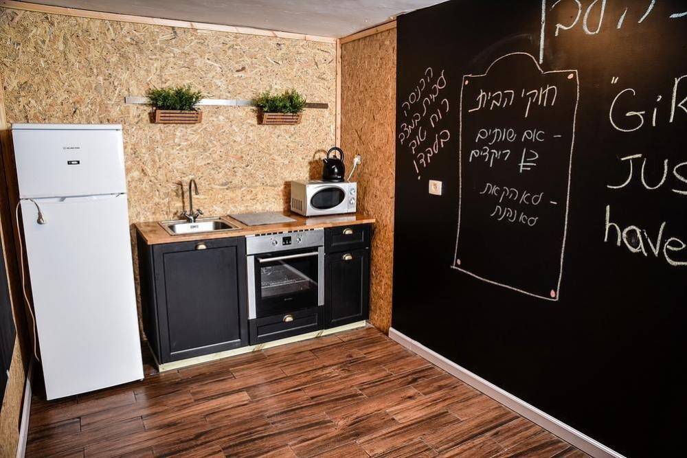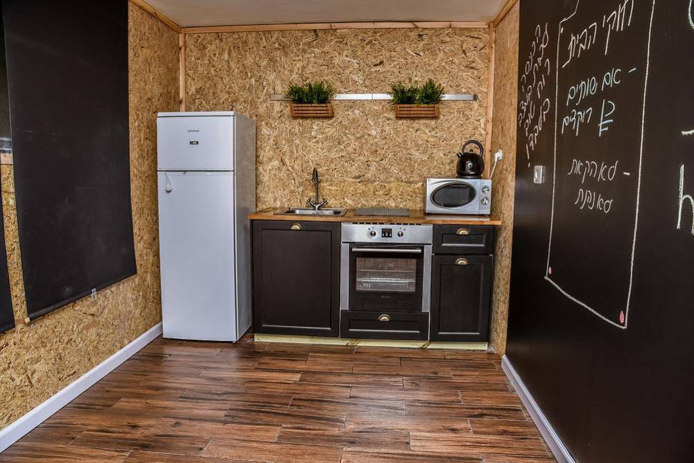 מטבח מאובזר הכולל: מקרר, תנור אפייה, מיקרוגל וקומקום חשמלי
