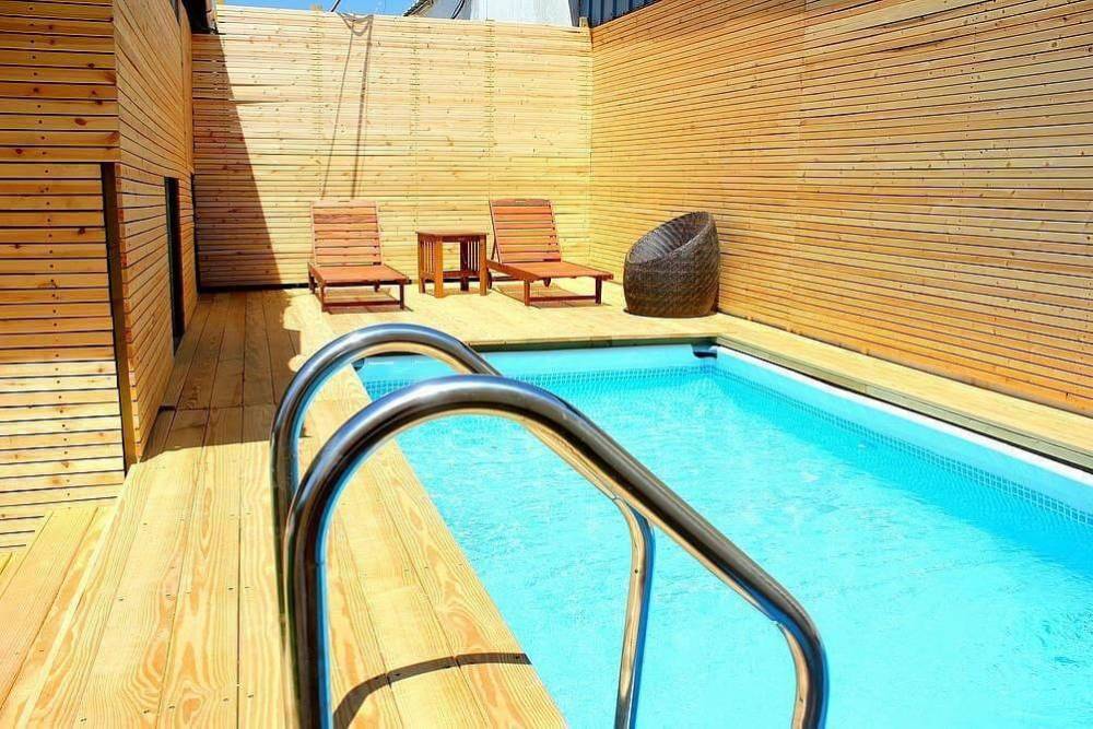 בריכת שחייה מחוממת בגודל 3 על 6 מחופה ברצפת דק איכותית