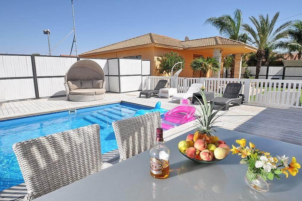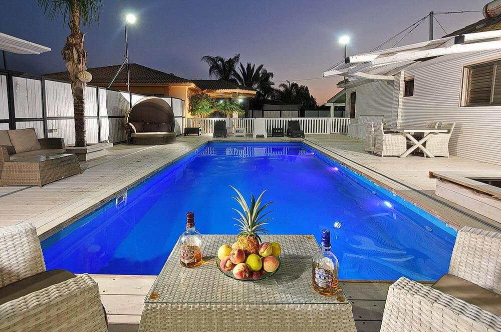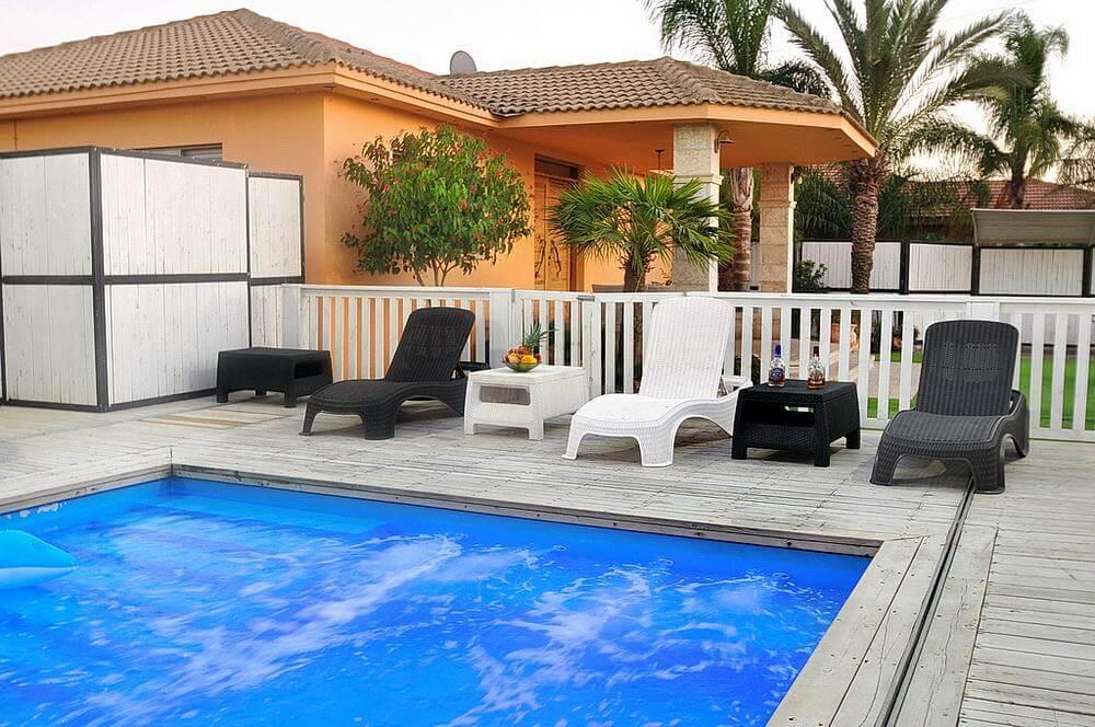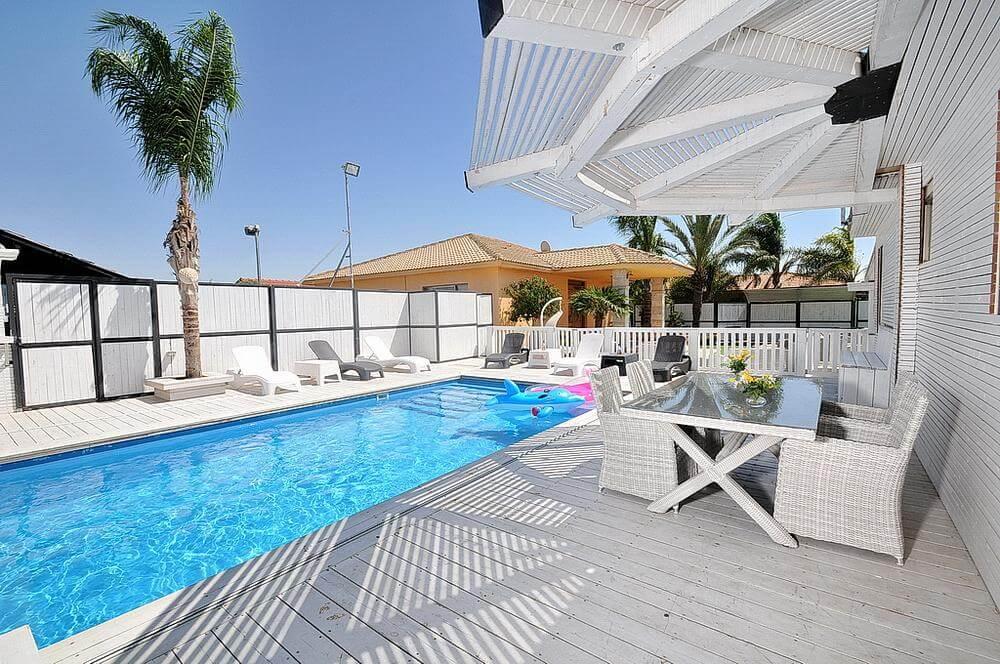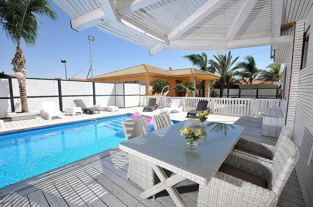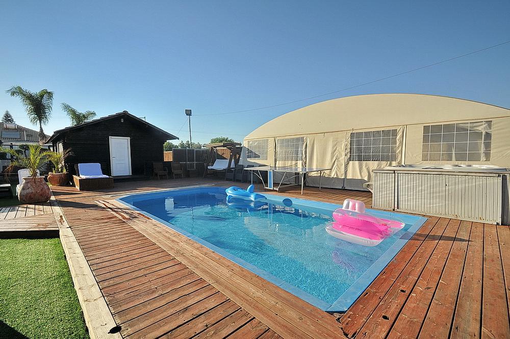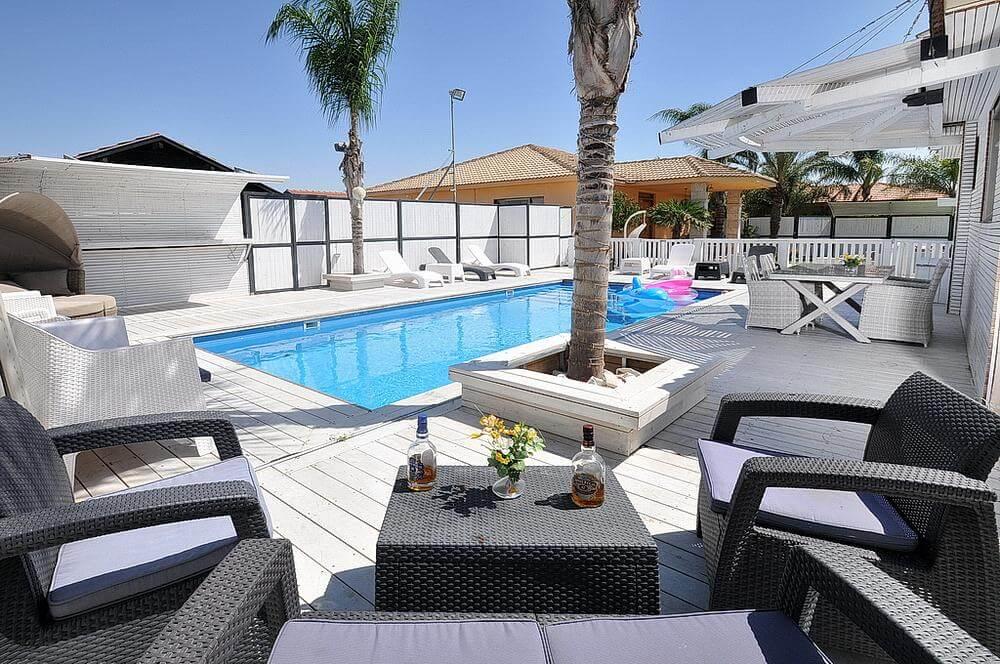 בריכת שחייה גדולה וצלולה + מיטות שיזוף