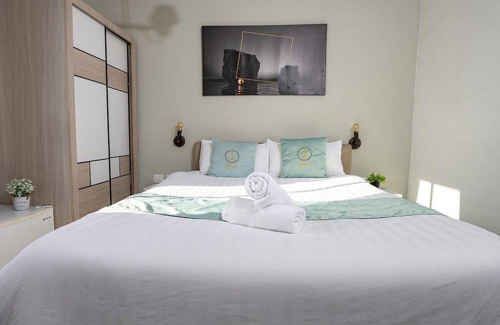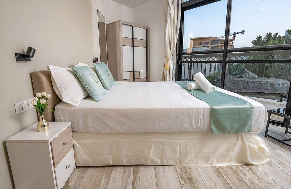 מיטה זוגית עם מזרון אורטופדי, ארון בגדים, מיזוג אוויר, מטבחון, חדר רחצה.