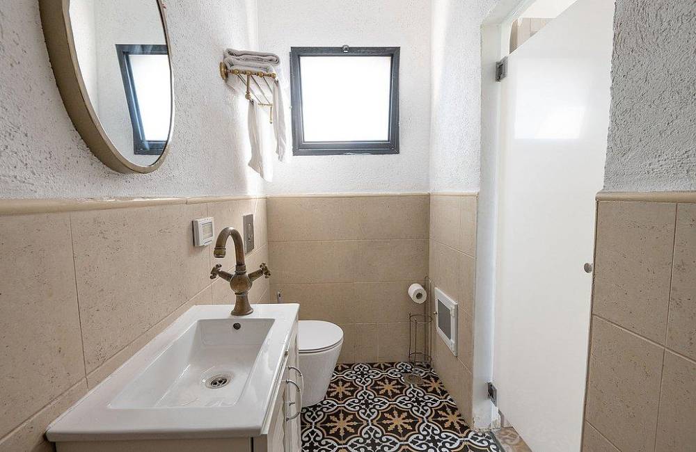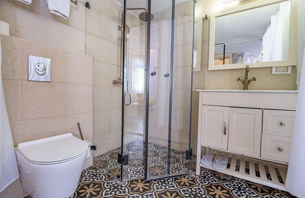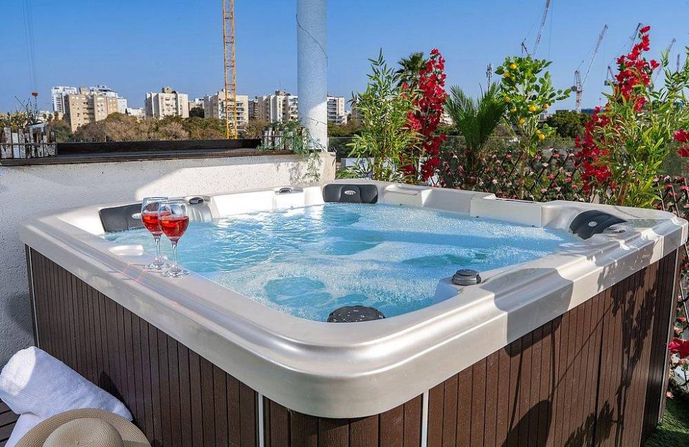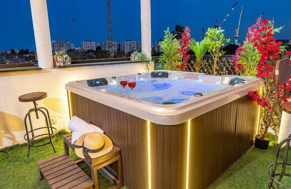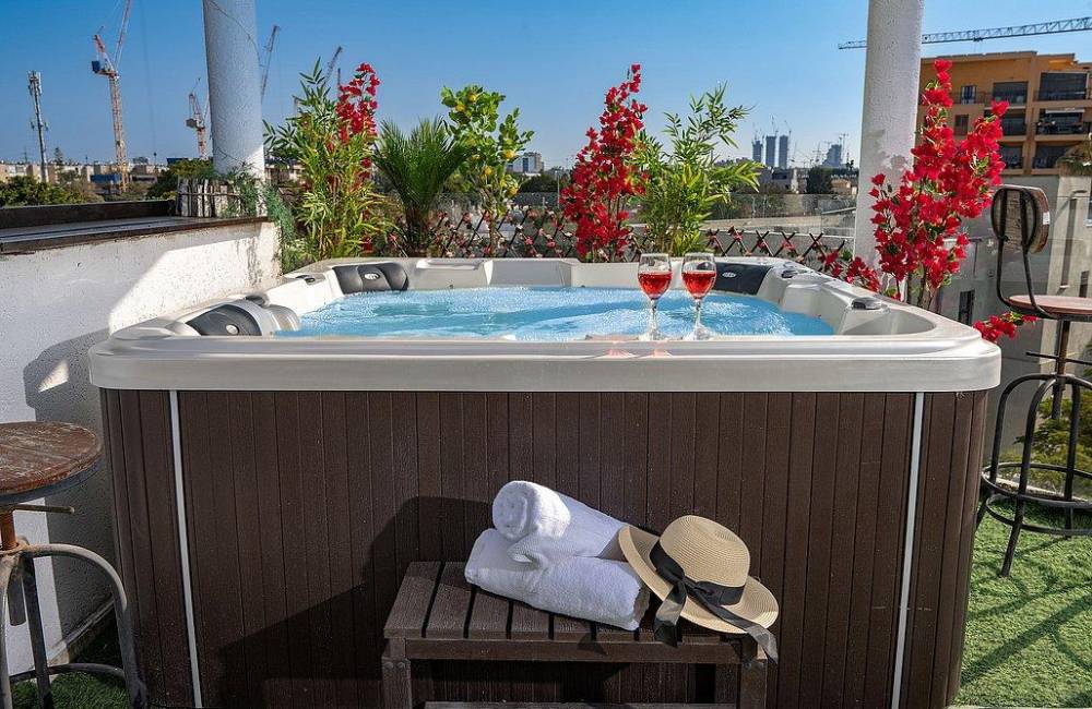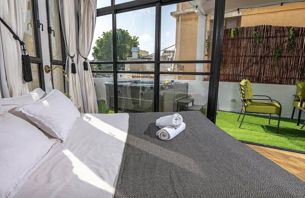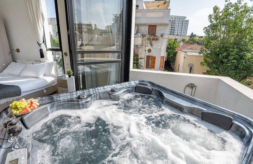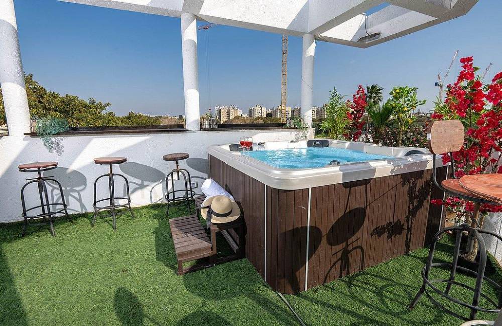 מרפסת גדולה פרטית עם ג'קוזי ספא מפנק, שולחן וכיסאות אל מול נוף יפואי אותנטי ומרהיב