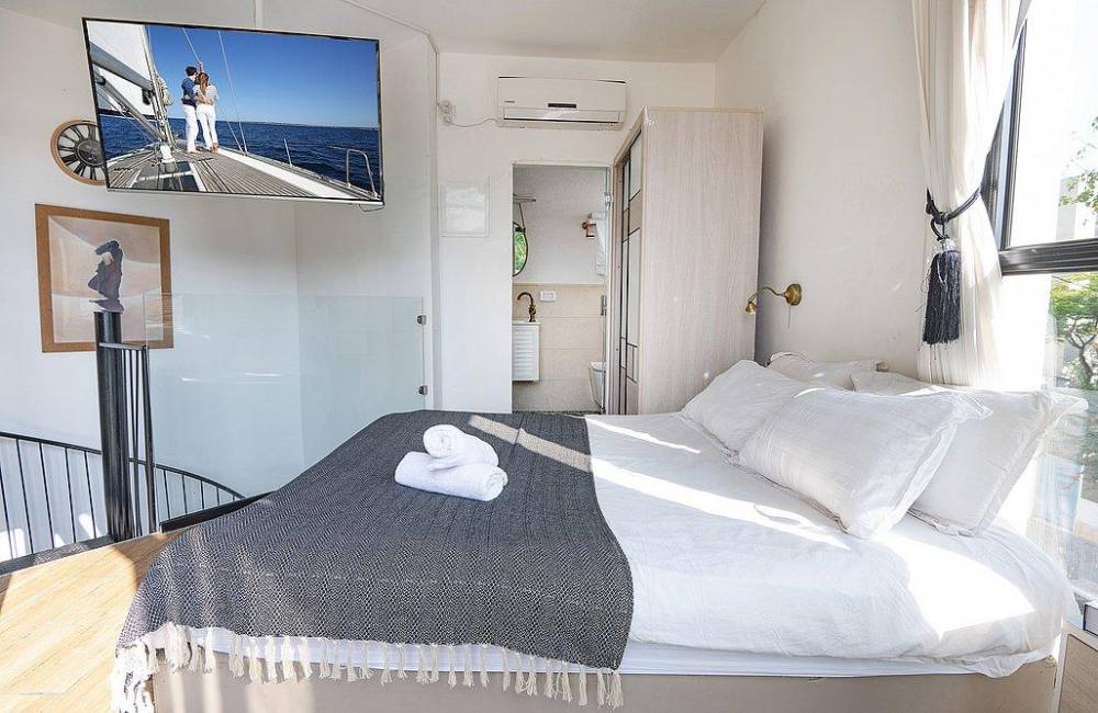 מיטה זוגית עם מזרון אורטופדי, מזגן, ארון בגדים, חדר רחצה עם מקלחת ושירותים