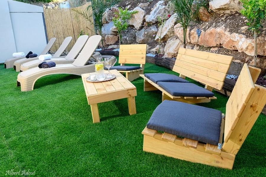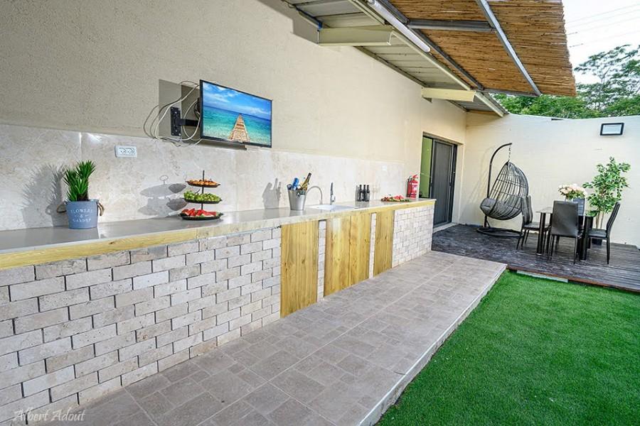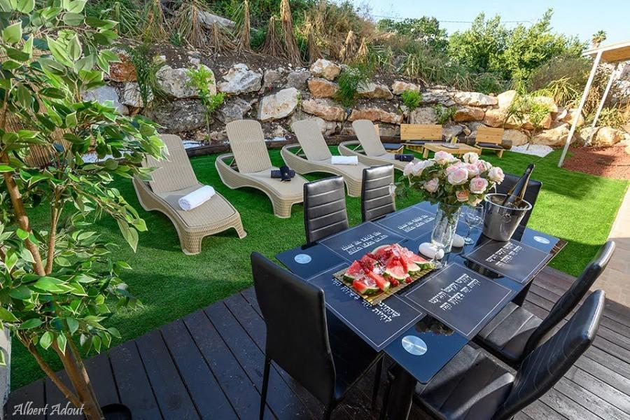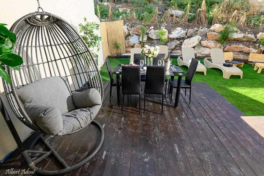 חצר גדולה עם מתחם דק ובריכת שחייה